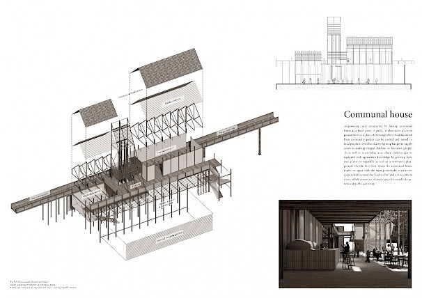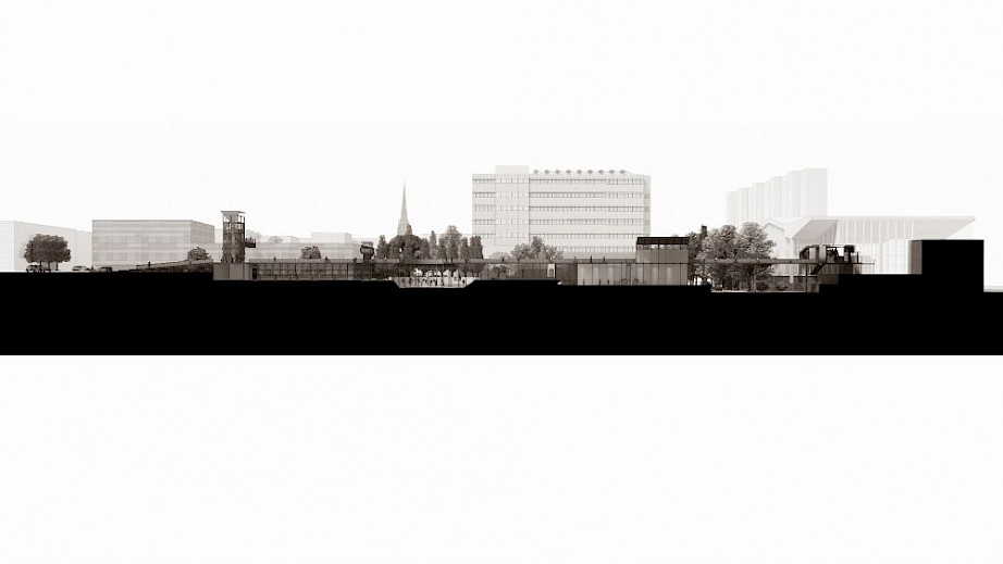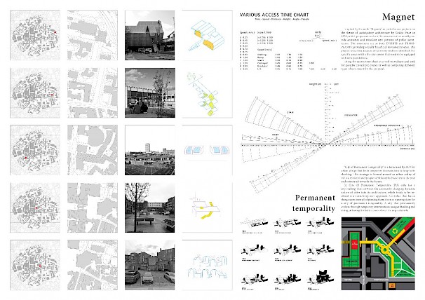 ‘City Centre South’ is a contentious developer-led proposal which includes the replacement of what is described as Coventry’s ‘outdated urban fabric’. This project is a reaction, polemically comparing the destruction of this major part of the city to Second World War bombing – thus providing an alternative. It suggests movement as a tool for recoding the city by reactivating and giving places meaning through re-connecting existing patterns with new possibilities. The proposal is a social interactive machine rather than a conventional public building. Structural features are paired with civic amenities, such as university buildings and an abandoned sports centre, which it aims to activate and support. Its activity derives from its peculiarity and programming, bringing students into the park so it becomes a place of exchange with local people.