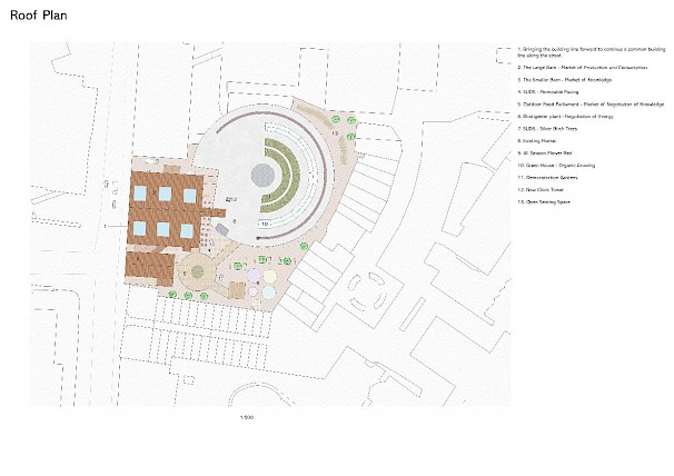 The design will be comprised of pragmatic agricultural buildings, an outdoor food parliament, a biodigester plant, and greenhouses with demonstration gardens.