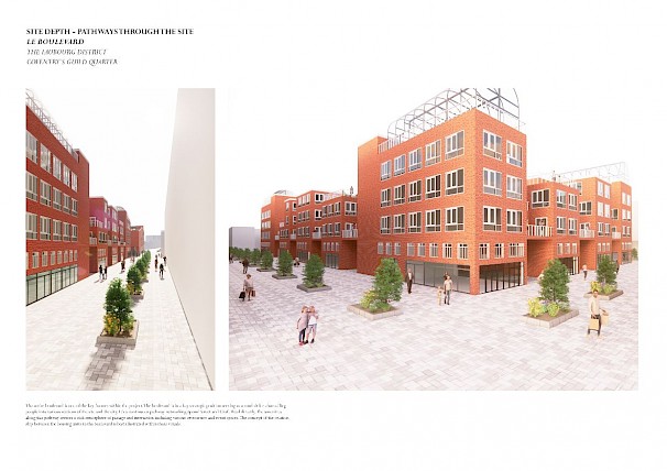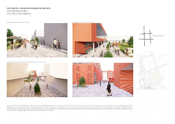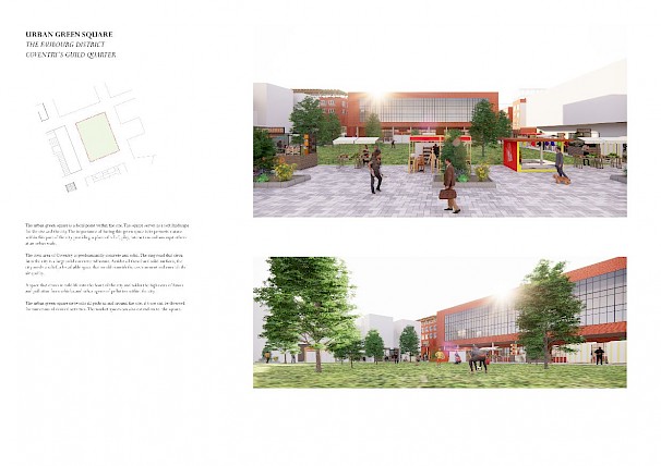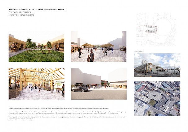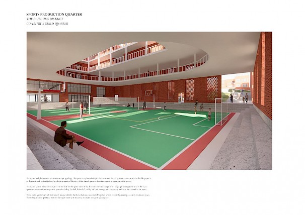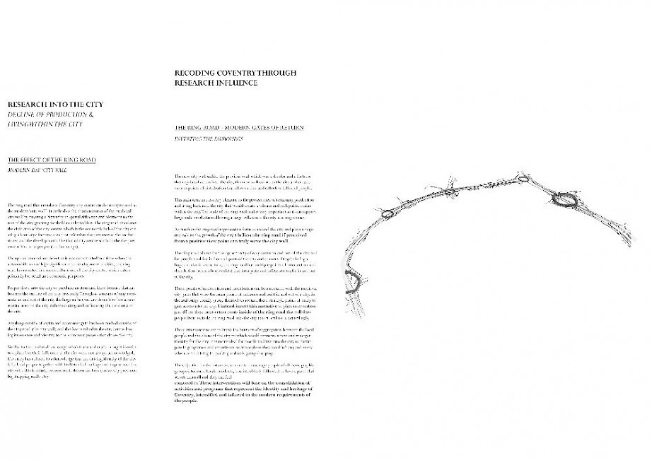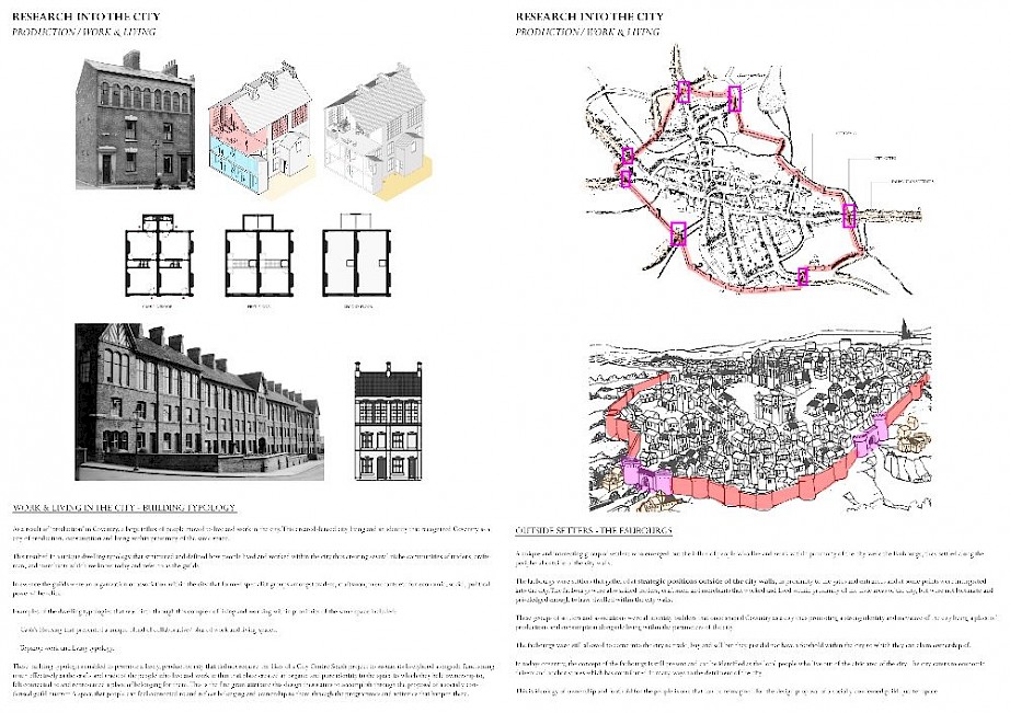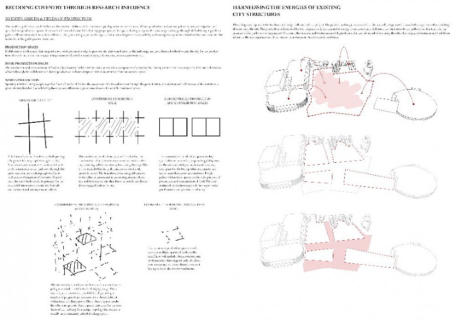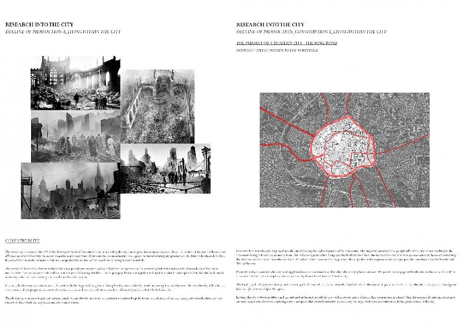 This design thesis as an alternative response to city centre south’s proposal will explore the city in depth through the lens and concept of ‘production’ within the city to identify attributes and characteristics about ‘production’ within the city that can be reimagined today for a better re-coding of the city that is a reflection of identity and heritage within Coventry.