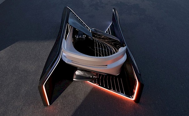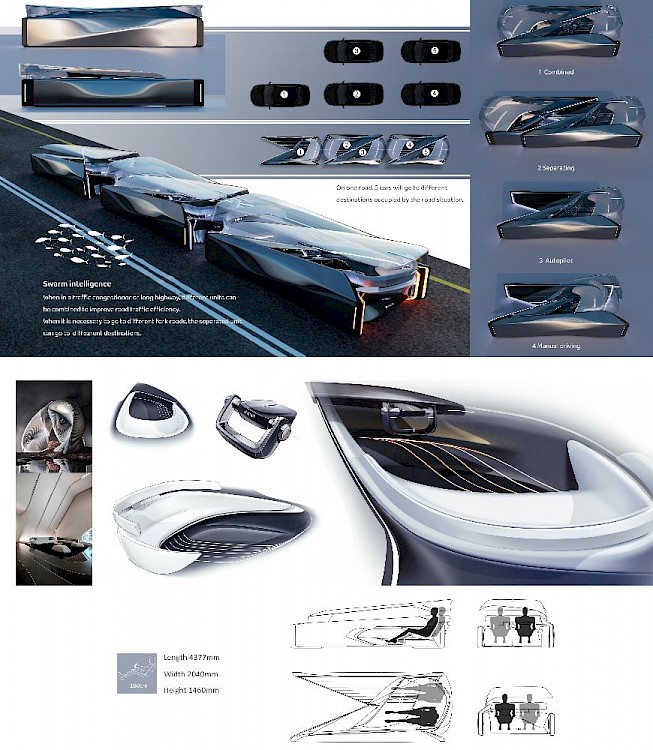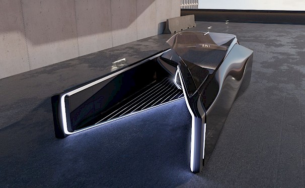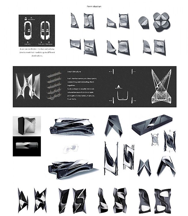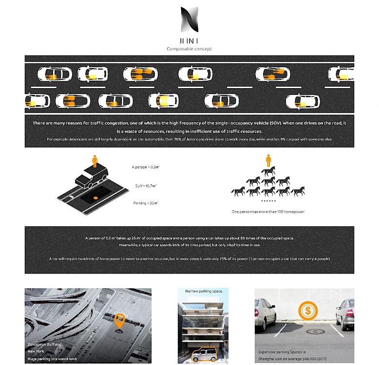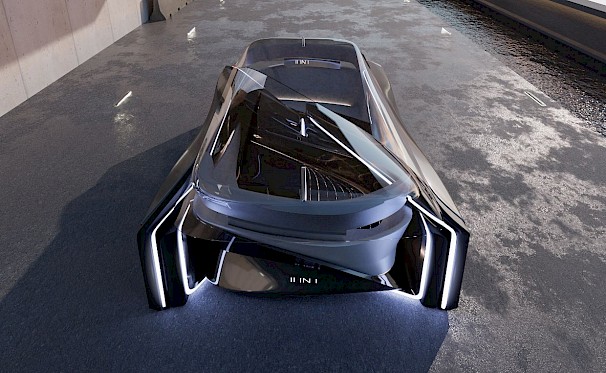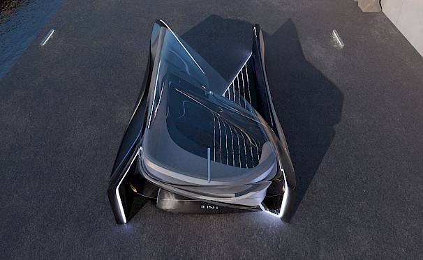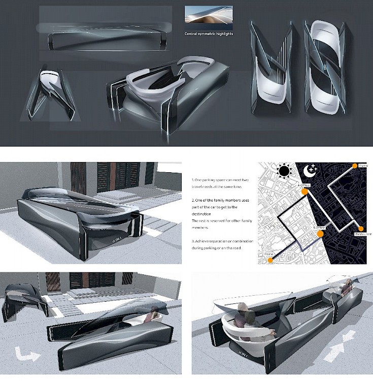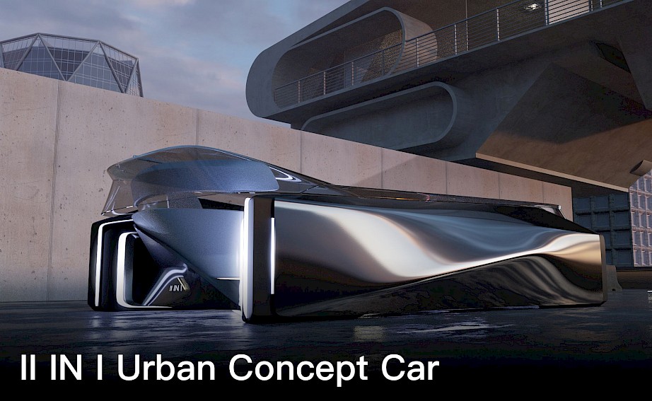 II IN I is an urban concept car that can be divided into two parts. Some of them can be driven by a single person. When more than two people want, two parts can be put together to form a whole. This can meet the two travel needs of a family at the same time. On the road, AI artificial intelligence and automatic driving are used to form a matrix to drive, so as to improve the use efficiency of the road.