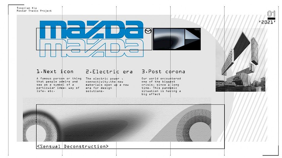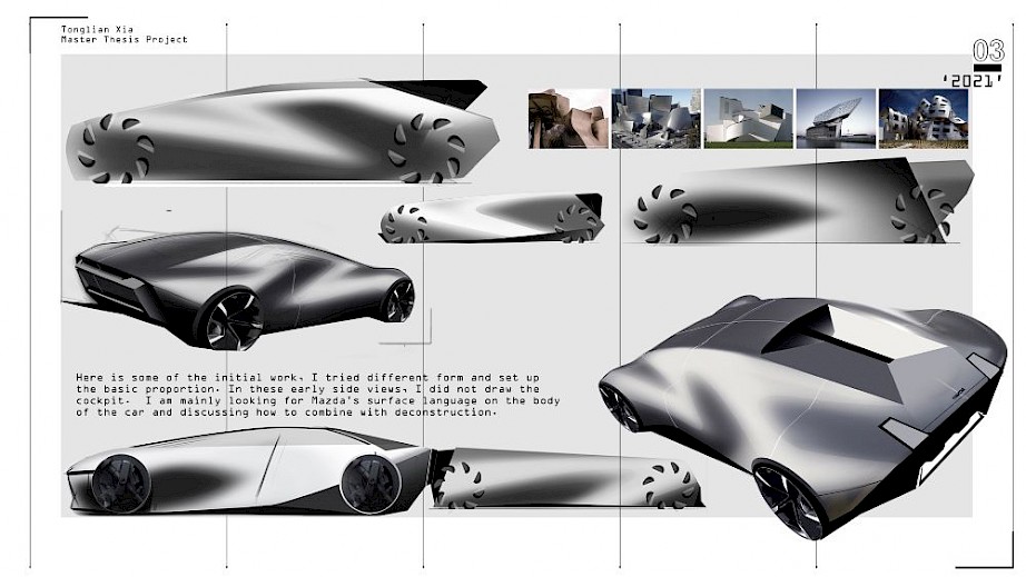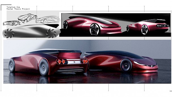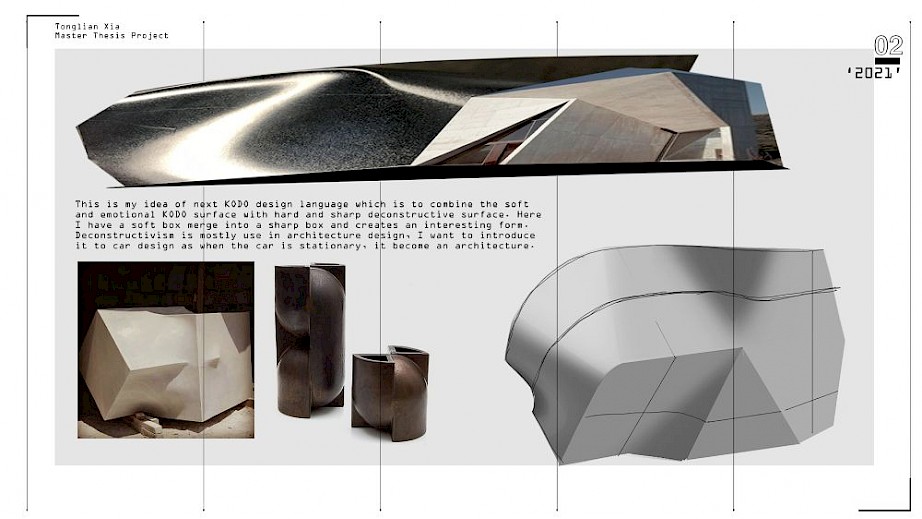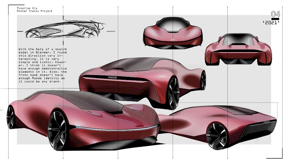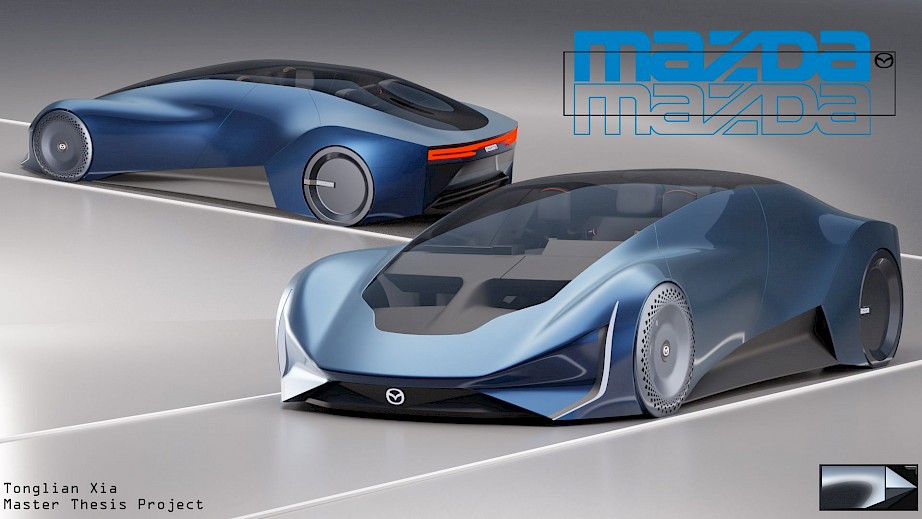 A D-segment EV vehicle for a broad range of buyers in 2035, capable of carrying 1 driver, 3 passengers, and luggage on city and country roads around the world, with one battery range up to 1000 miles, to provide users an exciting and premium travel experience. A redesign of the iconic Mazda 6. A discussion about how Mazda’s flagship model will evolve in the EV era and the evolution of KODO design language.