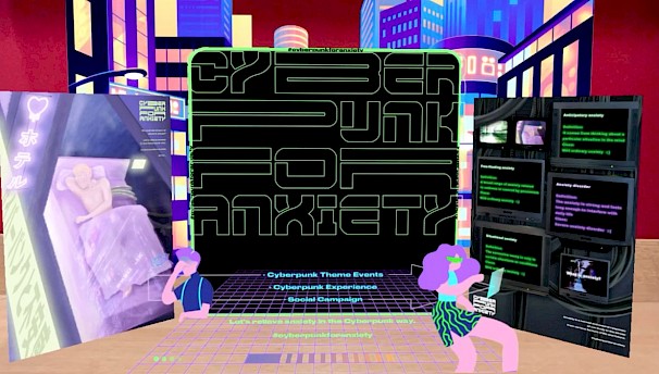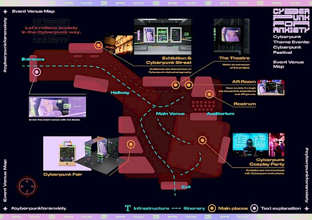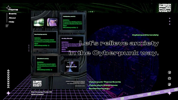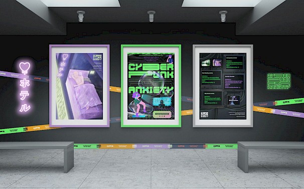 The project mainly consists of brand campaign and themed events, combining Cyberpunk aesthetics with theme of anxiety. It aims to promote the public's attention to anxiety and mental health problems, and improve the related cognition and understanding, so as to relieve anxiety and stress slightly by relaxing the body and mind through the immersive experience of Cyberpunk theme events.