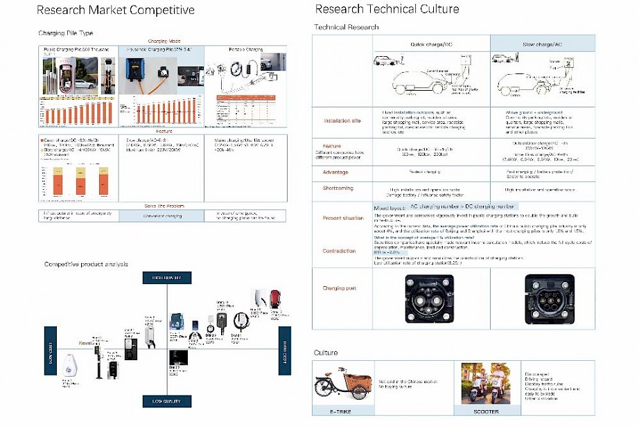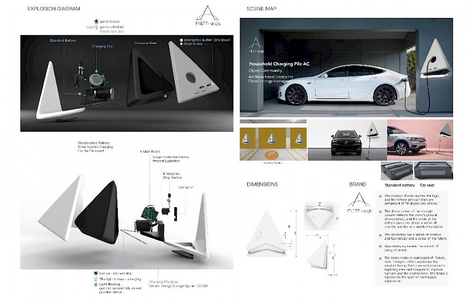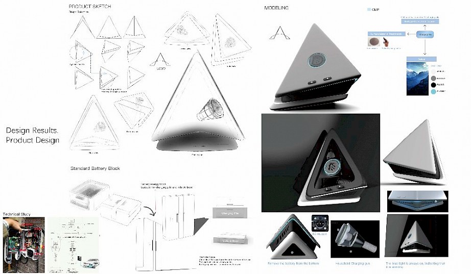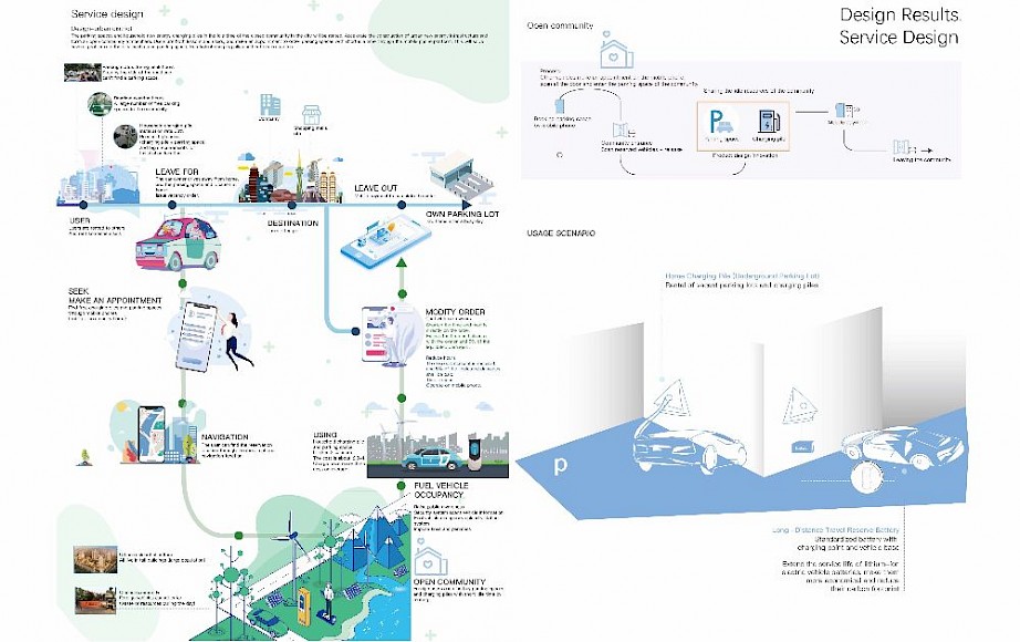The design part, Service design: lease the household charging pile and parking space to solve charging and parking. Product design: emotional design of the product to alleviate the anxiety of users waiting through light feedback. Adopt a new battery to protect the environment; Optimize the product's internal structure to avoid the risk of overheating and explosion.