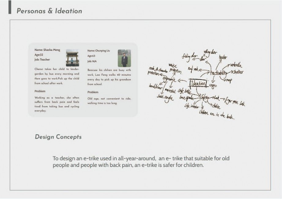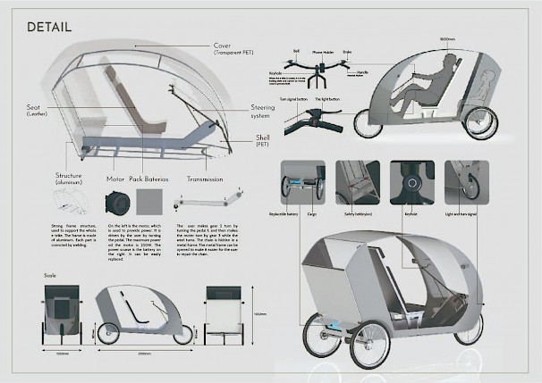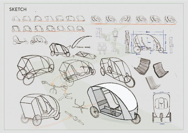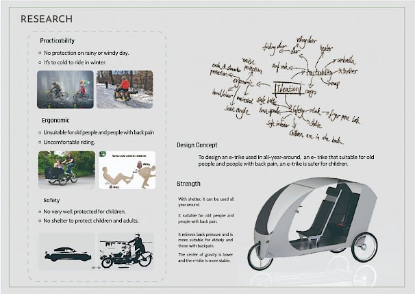 This project is about the design of an e-trike. Due to traffic congestion and environmental protection, more and more people living in cities are choosing to use the e-trike as a means of transport, so the demand for the e-trike is increasing. Design concept is that to design an e-trike used in all-year-around, an e-trike that suitable for old people and people with back pain, an e-trike is safer for children. Inspired by the horizontal bicycle, the driver is almost half reclined in the seat, when the lumbar region is at its most relaxed. The low centre of gravity in this way enhances the overall stability of the ride. The seat has been designed with ergonomics in mind. The roof canopy is designed to ensure year-round use.