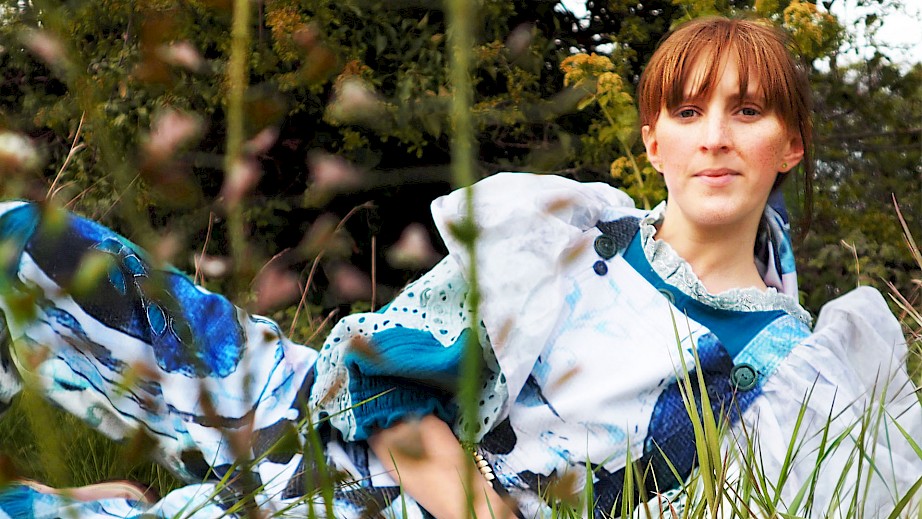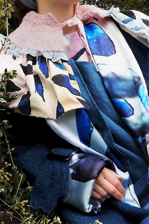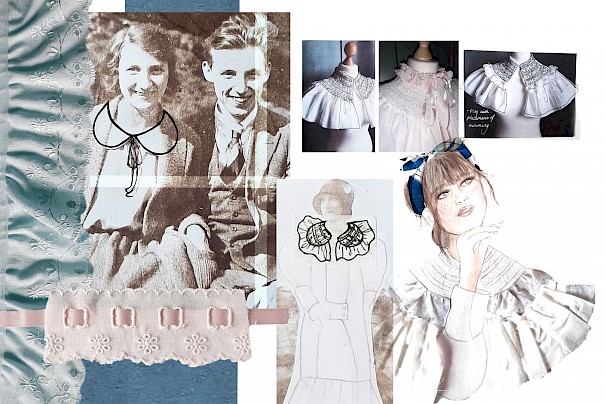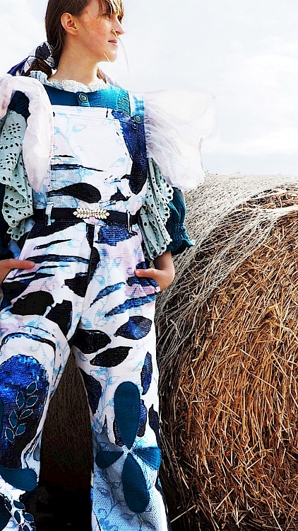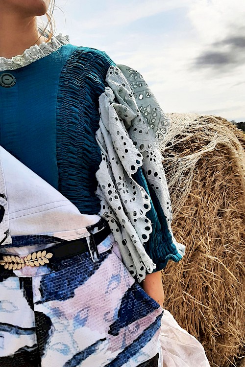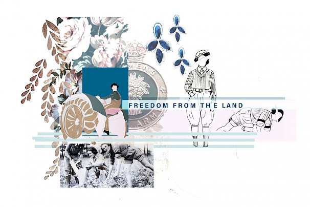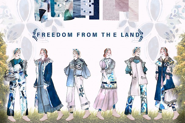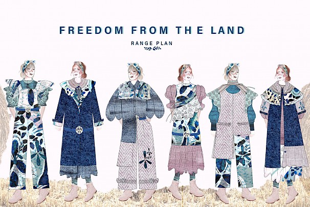 My family's heritage has always been important to me. For generations, my family have been involved in the agricultural industry; it's our inherited sense of family identity. Freedom From The Land not only honours the beautiful connection I have to my heritage but is inspired by the Land girls and the role they played in growing female independence, which was dominated by domesticated lifestyles during the 1930s/40s. Within my collection, there is a hidden message about sustainability. With the rise in demand for investment clothing that can increase longevity, I understood the importance of implementing sustainability into my garments. With inspiration from the Make Do and Mend rationing period during WW2, I developed decorative patches across my collection by reworking the scraps of materials into the garments. Second-hand trimmings from my grandmother are used to reinforce my family's heritage.