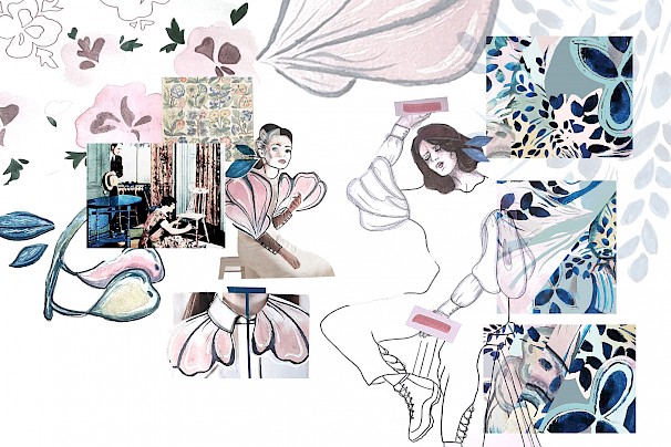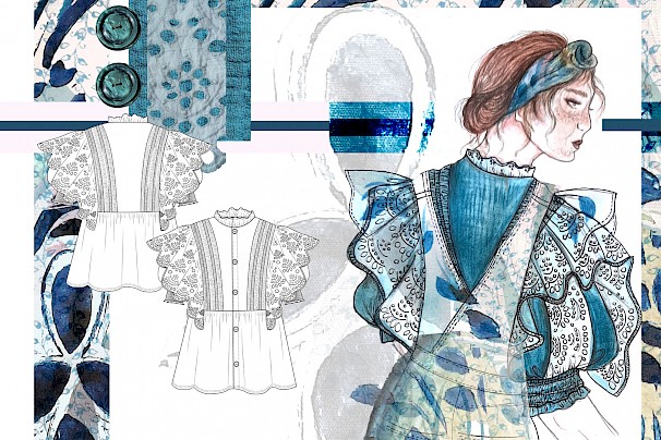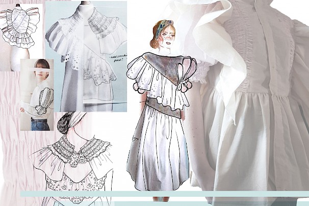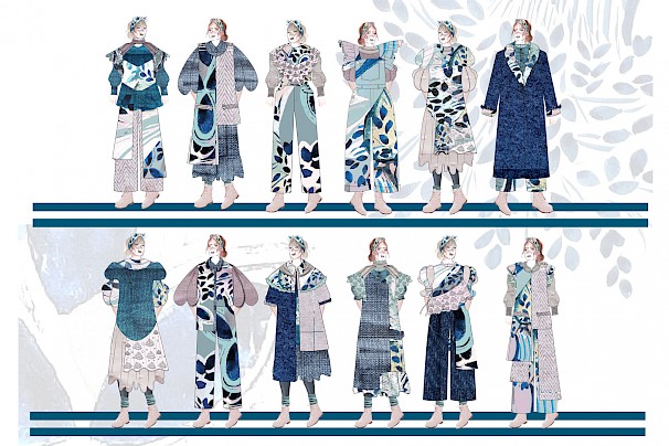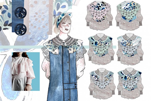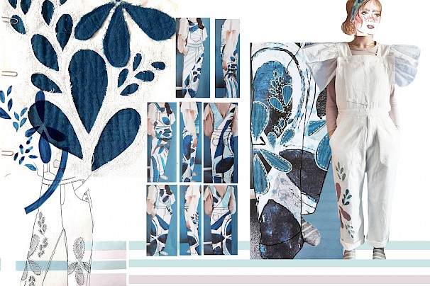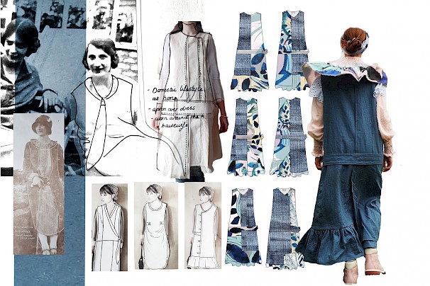 I wanted to create a heritage feel through my print development, whilst preserving a contemporary approach. I took 1940 interior design elements from my research and experimented with scaling and placements of my prints. My collection uses utility-inspired silhouettes, blended with smocking and feminine frills, to tie my story together.