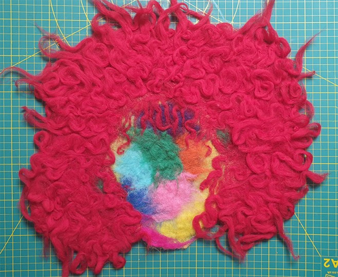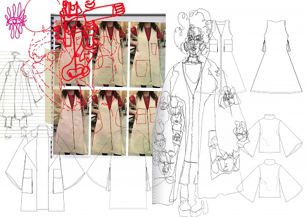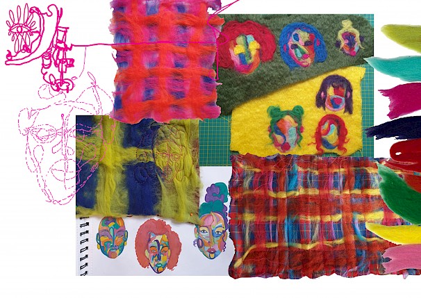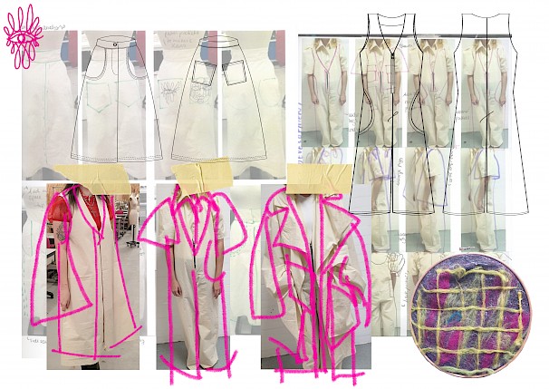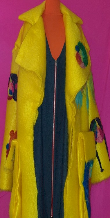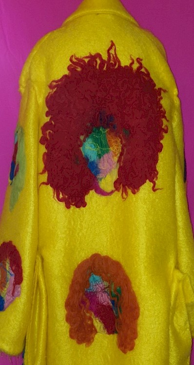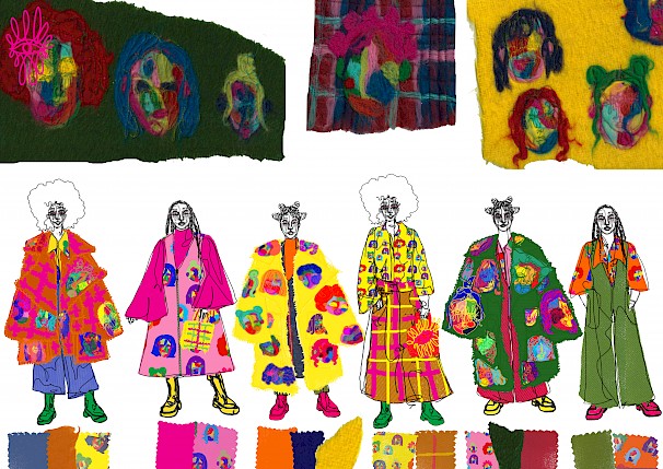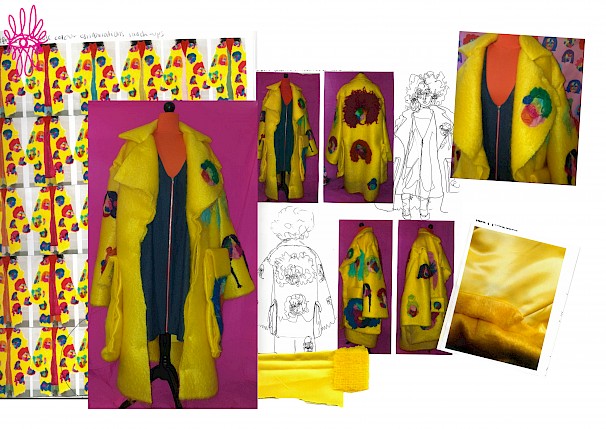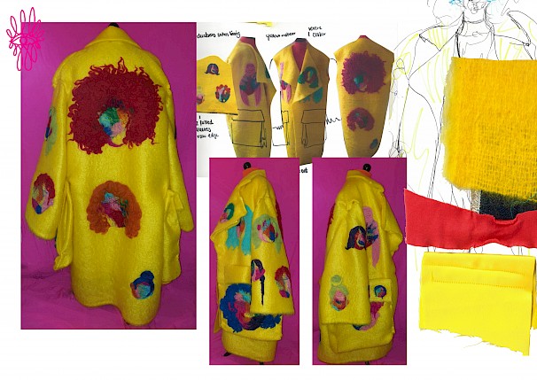 For my statement piece I designed an oversized trench coat to be embellished with needle felted portraits. Felted faces of various scales and colours were then finished with free hand embroidery in contrasting topstitching threads to draw attention to the eyes; in reference to the idea of 'seeing' and acknowledging the various forms of inequality faced by women.