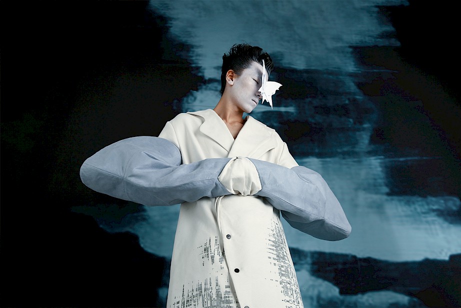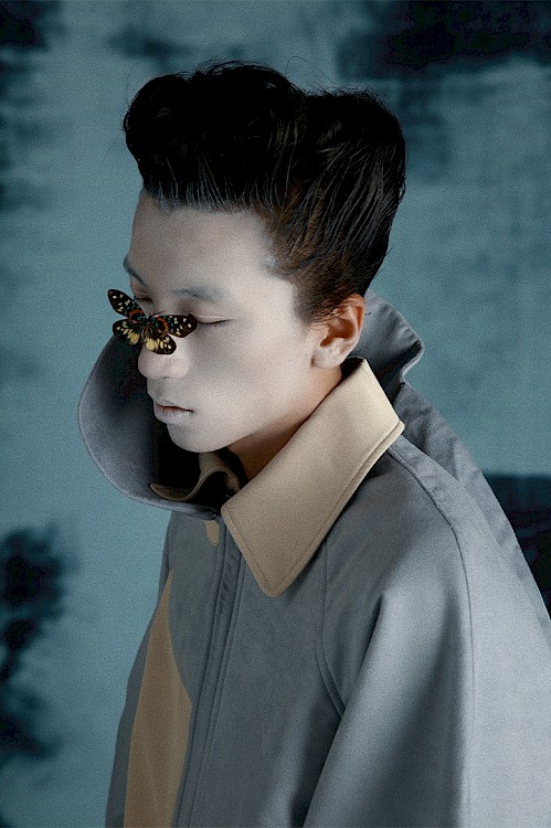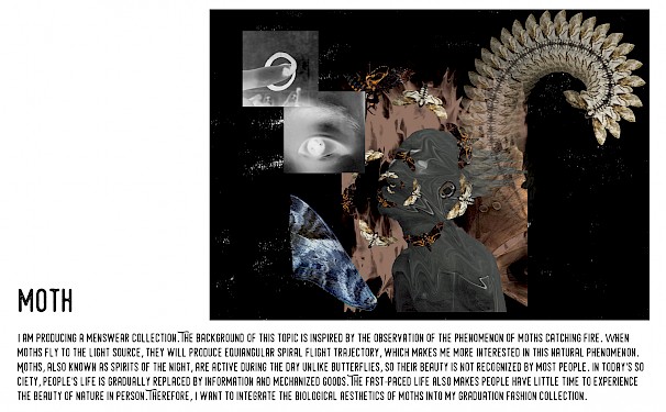 I am producing a menswear collection. The background of this topic is inspired by the observation of the phenomenon of moths catching fire. When moths fly to the light source, they will produce equiangular spiral flight trajectory, which makes me more interested in this natural phenomenon. Moths, also known as spirits of the night, are active during the day unlike butterflies, so their beauty is not recognized by most people. In today's society, people's life is gradually replaced by information and mechanized goods. The fast-paced life also makes people have little time to experience the beauty of nature in person. Therefore, I want to integrate the biological aesthetics of moths into my graduation fashion collection.