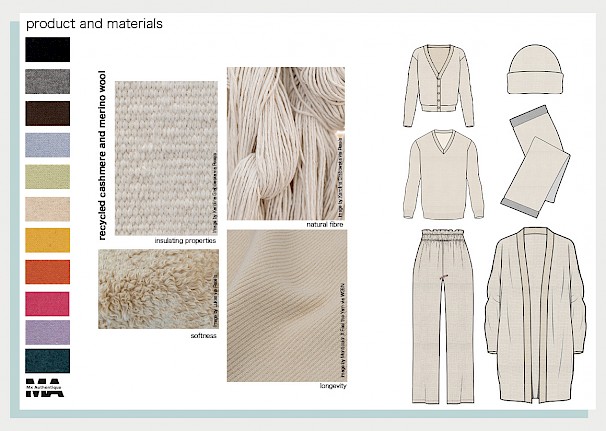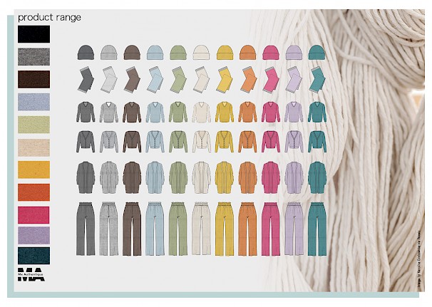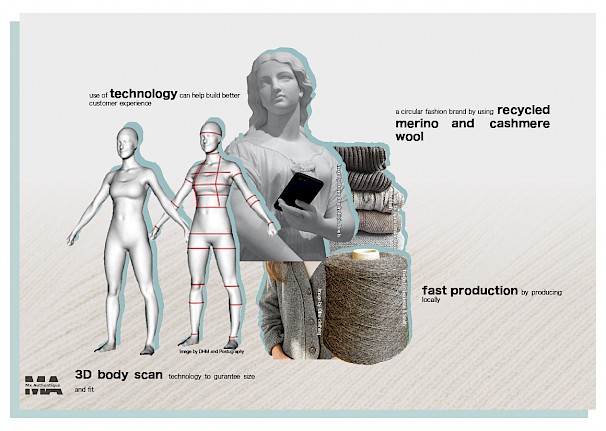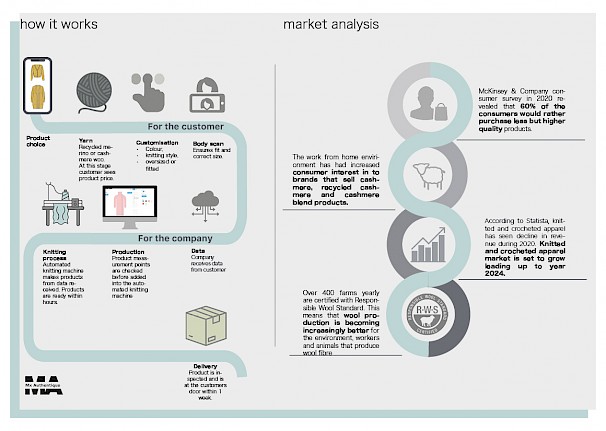 For Eliza's final major project, she worked on mass customised knitwear by using automated knitting and 3D body scan apps. The use of these technologies is helpful to make products on demand and cater for specific consumer needs – be it a size, a colour or a print. To further sustainability, chosen materials were recycled cashmere and merino wool due to their softness and insulating properties. Products to be made in a variety of colours, ranging from muted to bright tones. They were inspired by everything that can be found in nature and by timeless silhouettes that are easy to combine with other products in consumers' wardrobes.