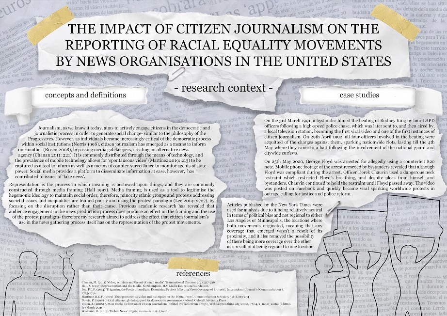 My name is Lilly Farnworth, and for the last three years, I have been studying Media and Communications BA. I have been actively engaged in social media and the discourse surrounding it since a very young age. The impact that social media has to influence different institutions and people's attitudes is something that interests me immensely- especially during the George Floyd Protests beginning May last year. During this period, I noticed how the majority of the information that I was receiving regarding the ongoing events was originating from social media, with people attending the protests posting the videos and photos that they took on social media revealing the actions of the police that the mainstream media were ignoring. Twitter was my main source of information and education, and I talked to many people at the time who did not use Twitter who were incredibly unaware of much of the violence because of what the mainstream media was representing, causing them to have a vastly more negative view of the protesters. This led me on to the topic of my dissertation- the impact of citizen journalism on the reporting of racial equality protest movements by news organisations in the United States.