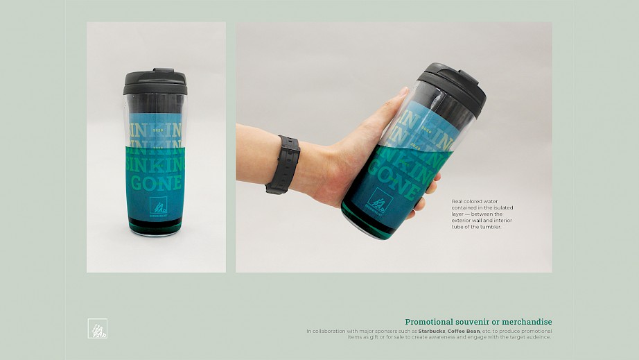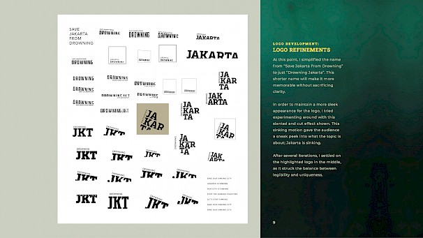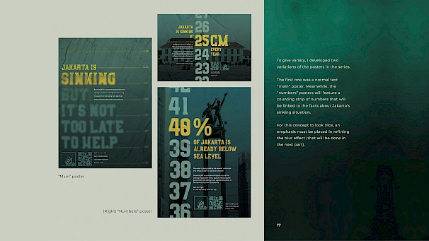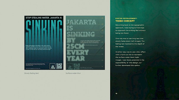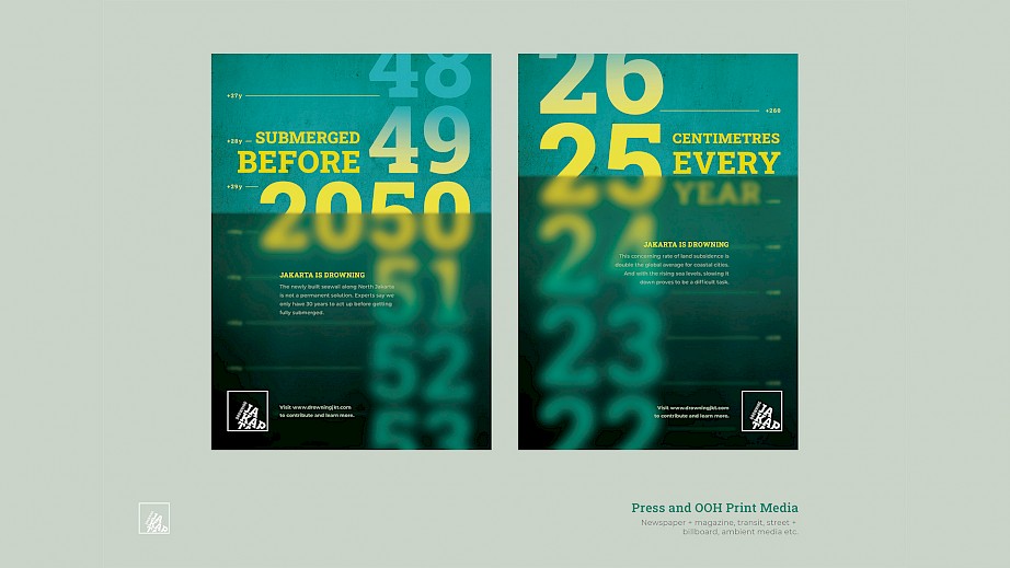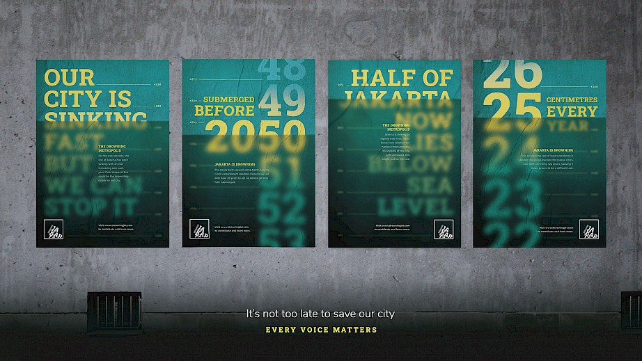 A real problem that the majority of people failed to realise is that Jakarta’s land subsidence issue might be a fatal threat to the city. The design focuses on the aftermath—with the sinking already in effect—to let people know that this is an ongoing danger. The very visible twist of the typography and the unique water-based collateral catches people’s attention, making way for the smaller subtitle and details to further educate them.