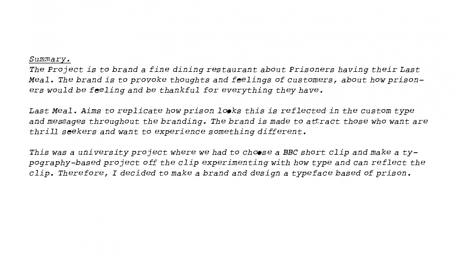 I hope you like my Project Last Meal; it is one of the hardest briefs I have worked on. I had to complete it using a range of skills from type development to branding.