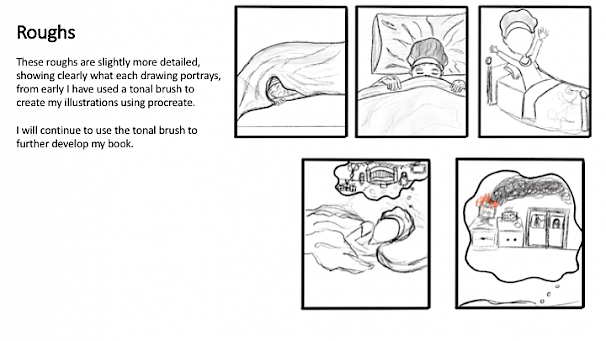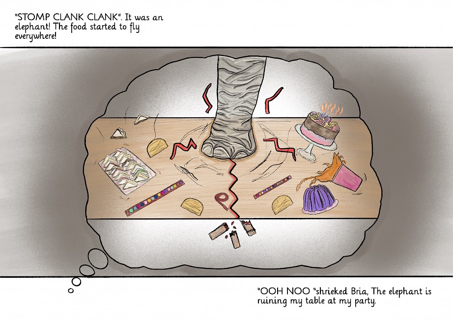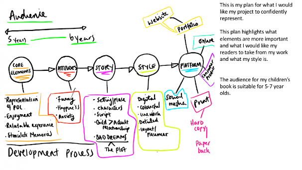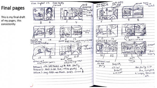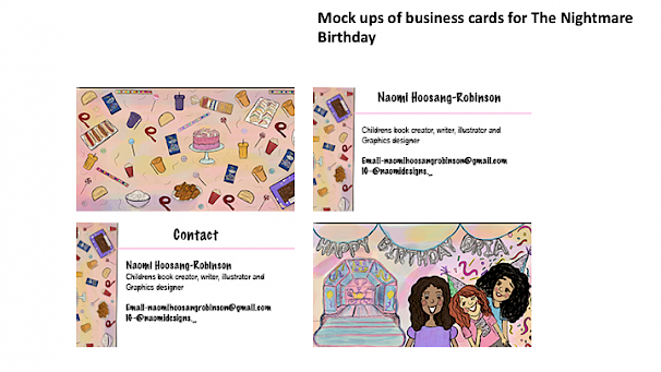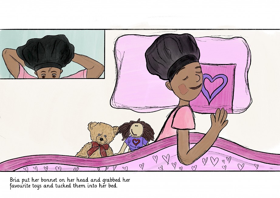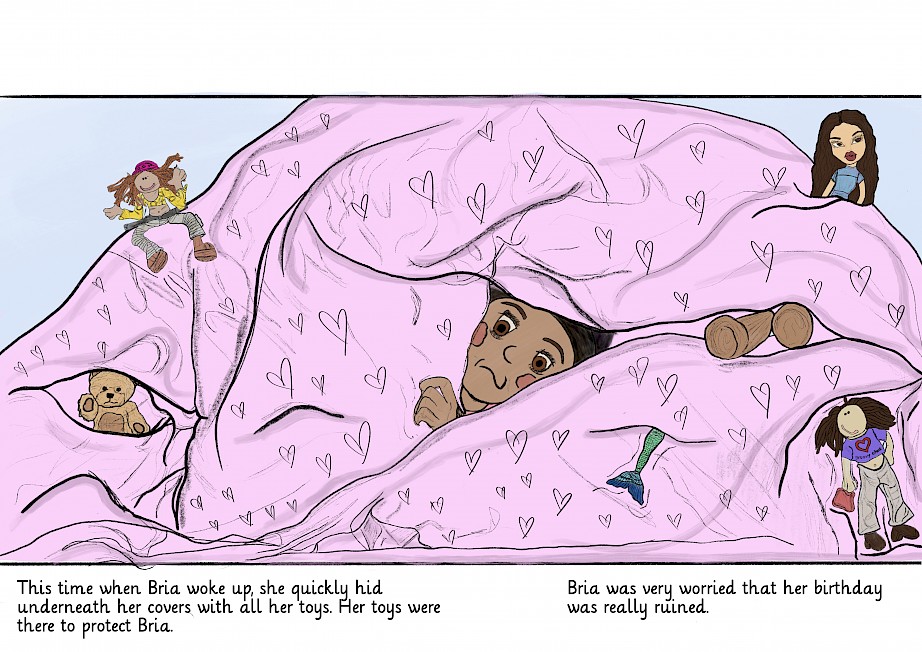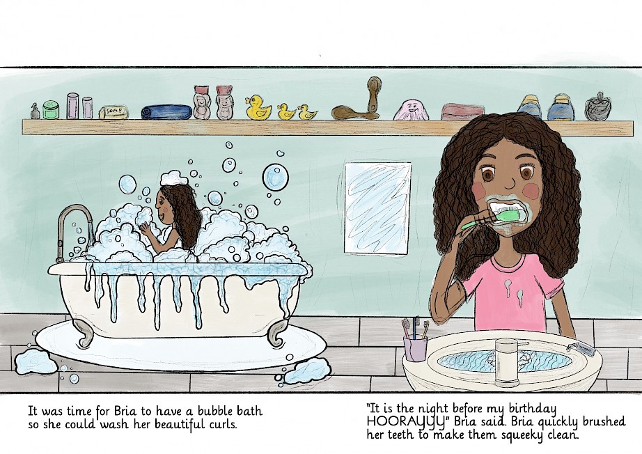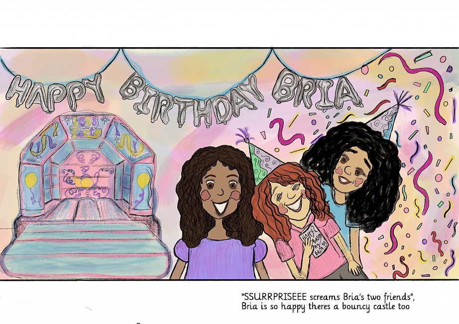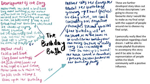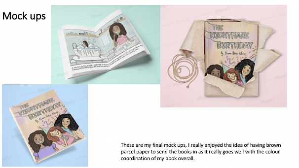 This is my project The Nightmare Birthday. This children's book presents how Bria deals with her anxiety throughout the night before her 7th birthday, I have chosen to highlight aspects of anxiety in children using her being nervous and excited all in one for her birthday as an example, the last few pages of the book presents celebration, portraying a positive outcome! In this story the villain is the nightmares Bria and the victory Is how lovely Bria's birthday truly turns out to be! Throughout each page there are continuation elements that show in the different pages as the story goes on. This book also portrays a positive reflection on what it may be like for children, for every child they will be able to spot things they may see in the story that they may have had at their own birthday, especially for some of the parents who may read this story. The child is a young black girl and I wanted to give the black community an opportunity to enjoy reading this book, and being able to relate to certain elements, such as the process of having to cover your hair whilst you sleep at night.