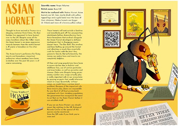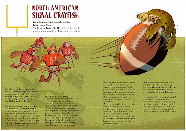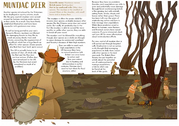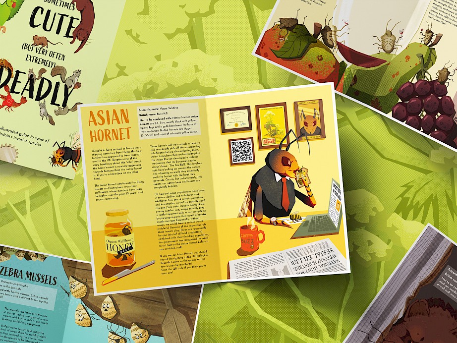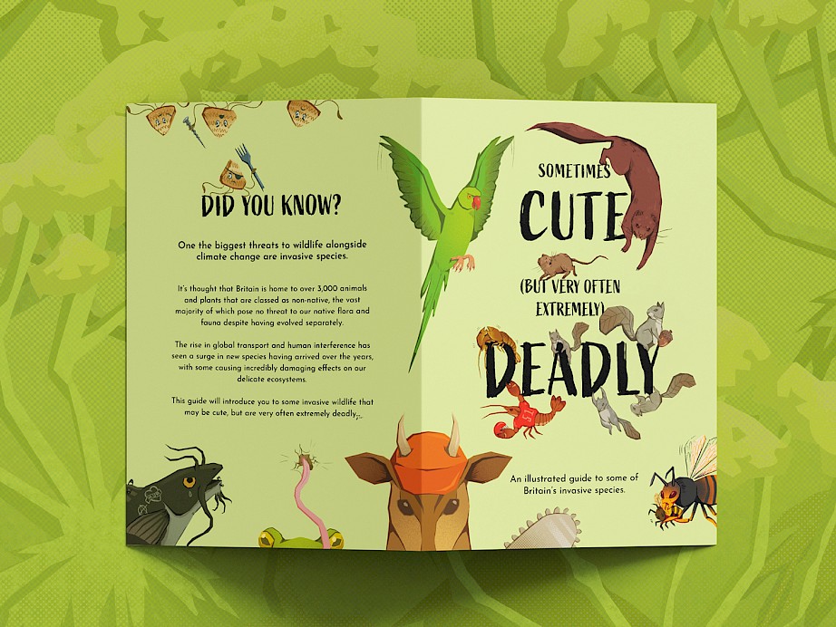 For my final major project, I created a 32-page illustrated book on invasive UK wildlife species. As we all turned to nature for some much-needed escapism during the pandemic, I wanted to raise awareness about an important ecological issue affecting our wildlife. Invasive species can often be a bit of a contentious topic, so I wanted to make something light-hearted and easy to get your teeth into. The final guide is full of colourful illustrations and silly characters that are informative yet fun. You can view the full book here: