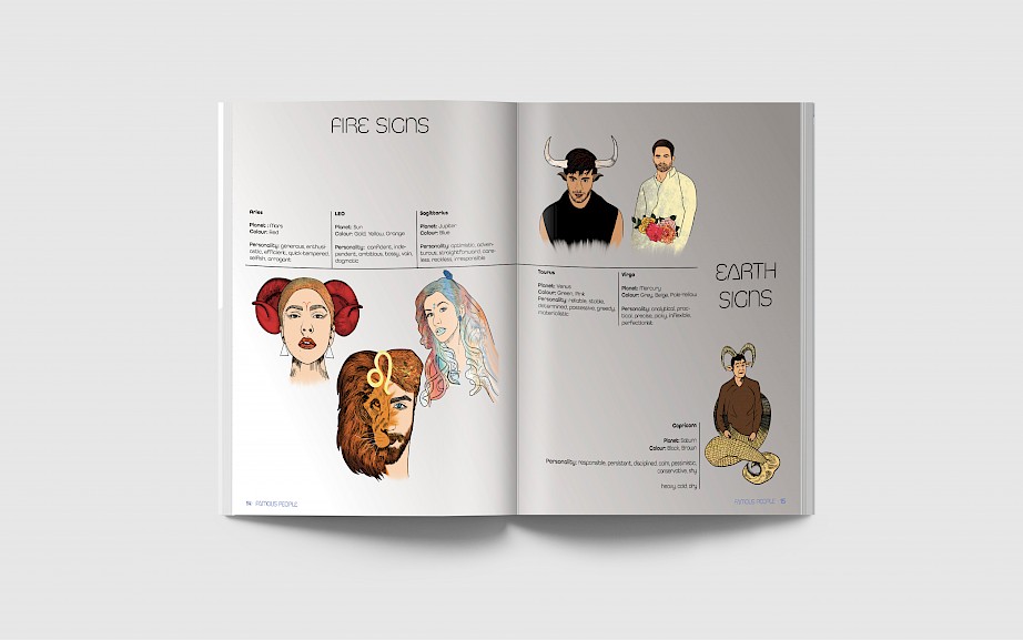 My Final Major Project is a magazine based on zodiac signs and it's called ''The Universe and the Stars''. I wanted to combine my passion for graphics and tattoos into a single publication. For thus project I have designed several editorial pages and focused on celebrity tattoos as well as writing article on the zodiac symbols. Each page is illustrated with a set of unique illustrations aimed at evoking the mystical qualities of zodiac whilst stylistically exploring the methods and the techniques from the world of tattoo design.