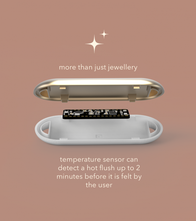 I am Amelia, an individual continually advocating for equal health and wellbeing for everyone through design. In this project I chose to address mature women's health and an unspoken subject, menopause. I created a piece of wearable technology that is as beautiful as it is useful. With 40-50 million women in the US alone, and 10 million in the UK experience hot flushes with little to no help, this wearable will aid in the management, understanding and monitoring of hot flushes.