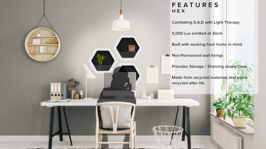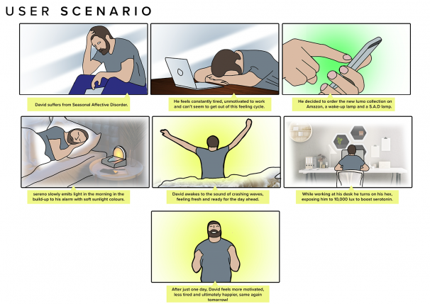 Sereno and Hex were born out of the below-standard existing products for those who suffer from Seasonal Affective Disorder, which I have identified as being bulky, overly medical, expensive, and ultimately do not put the user-needs first. S.A.D is caused by a lack of sunlight, which then negatively affects the hypothalamus in the brain, resulting in the reduction of Serotonin and Melatonin, potentially leading to depression.