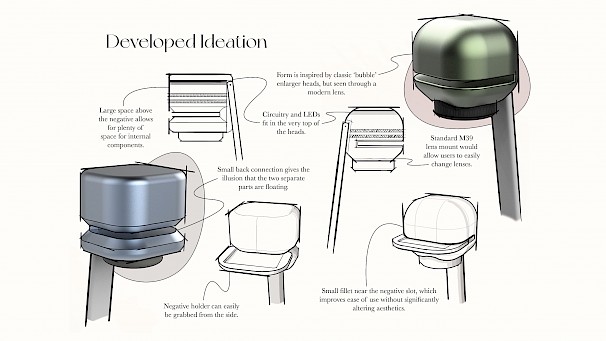 Darkroom printing has the potential to join this boom, but is held back by confusing, outdated equipment. Agrandir aims to solve this by presenting a contemporary enlarger, designed with the young, spatially-conscious user in mind. Agrandir is a 35mm black and white photographic enlarger that can be folded away, increasing portability and reducing space consumed when not in use.