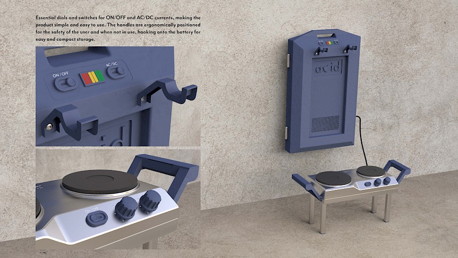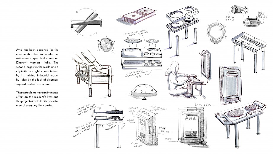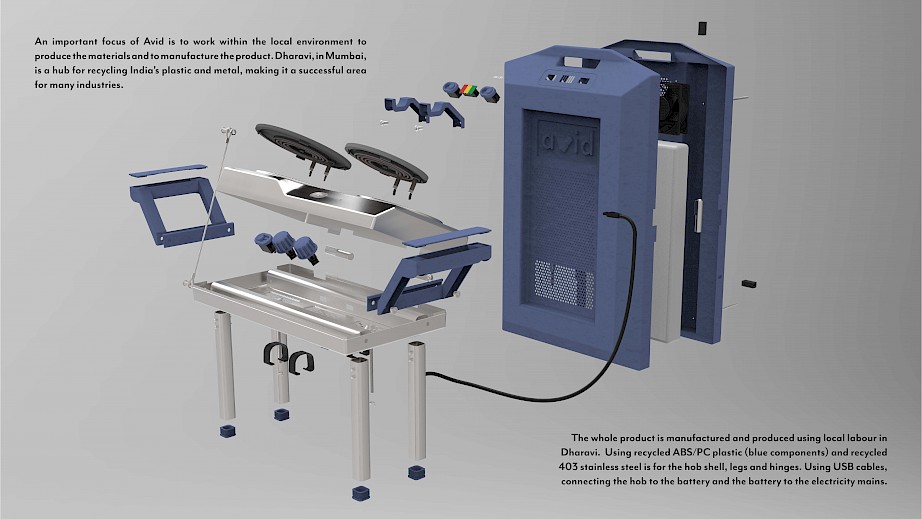 Avid (achieving vital innovation in Dharavi) is an electric hob and battery charging system for electricity in deprived communities of Dharavi in Mumbai, India. The focus was to create a product as sustainable as possible, using the existing large scale recycling resourcefulness and their thriving hub of industry, whilst delivering a major contribution to these communities and their families.