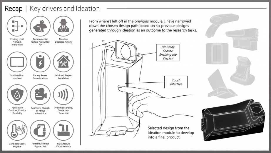 My final major project focuses on connecting both interior and exterior users when leaving parcels at the doorsteps of properties. The device uses tensorflow object recognition to detect parcels left at front doors by delivery drivers and also detects any motion outside the front door acting as a contactless doorbell all without storing any unwanted surveillance of visitors. The product makes use of standard components and open source software, meaning it can be sold as a kit or 3D printed and sourced using the parts list.