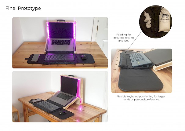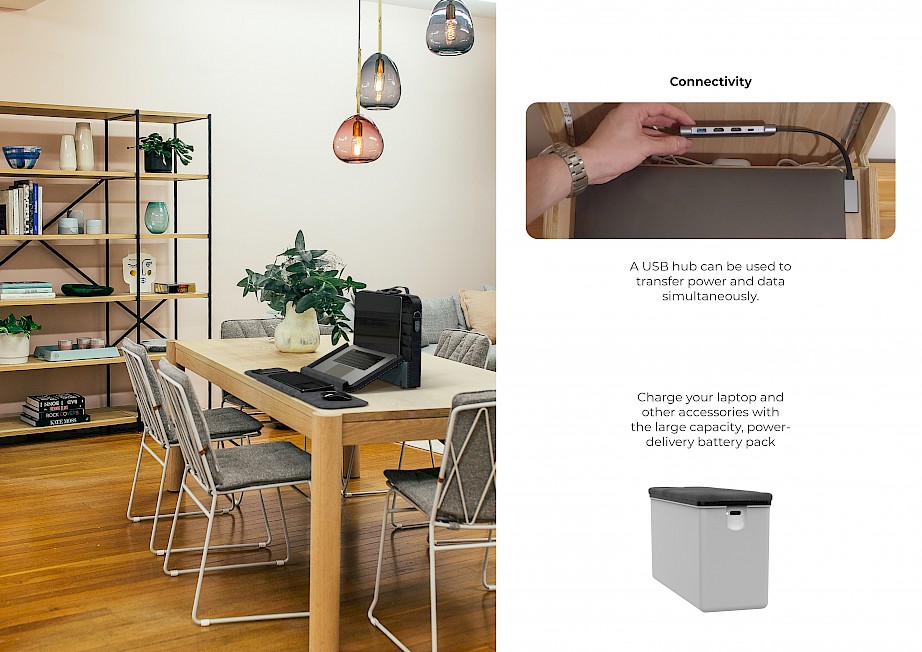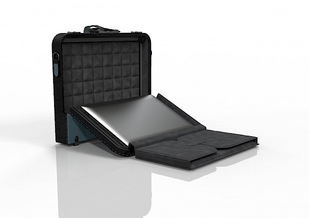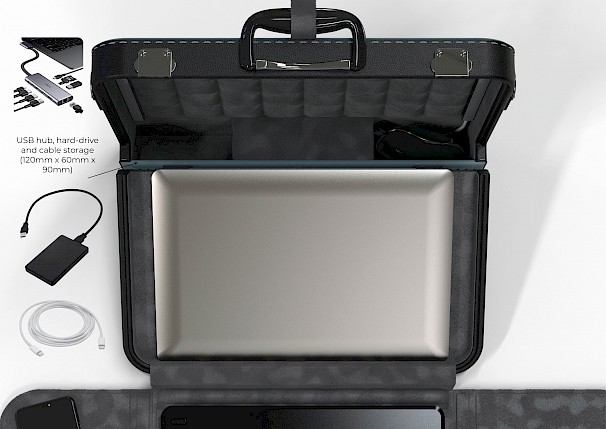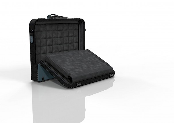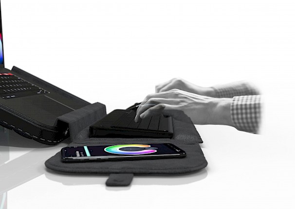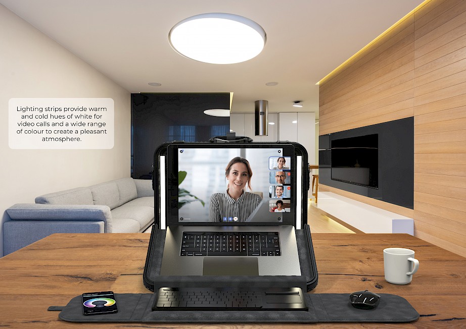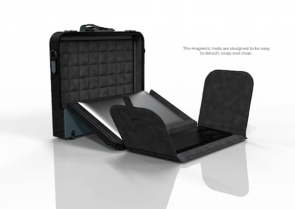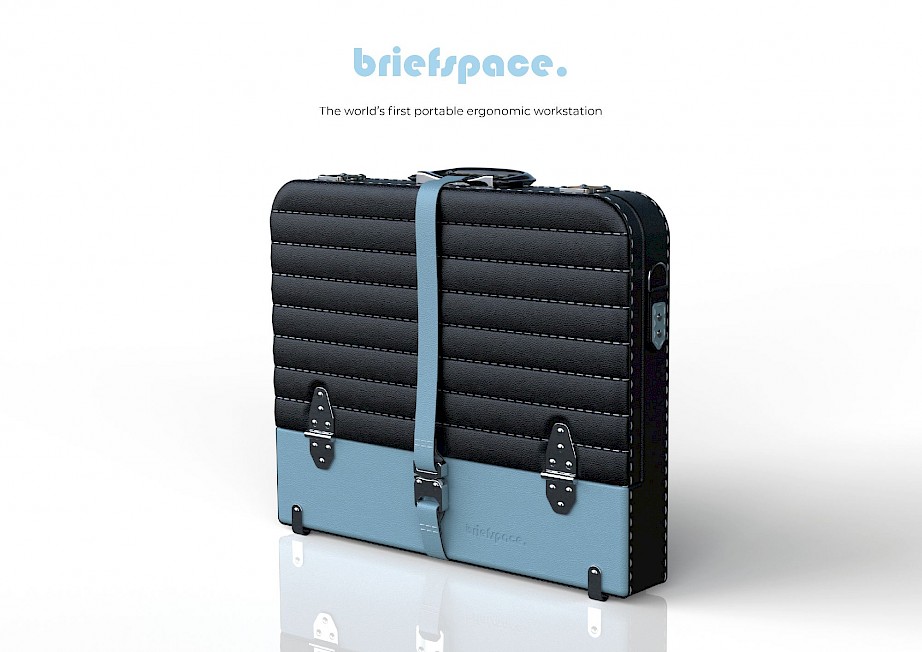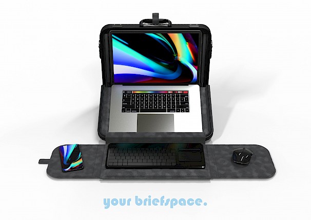 'briefspace.' aims to improve laptop ergonomics and portability to aid posture and productivity. Designed for those working at home, in third spaces or hot-desking. The padded case incorporates video-call and mood lighting, integral keyboard and accessory mats, as well as a large capacity rechargeable battery pack.