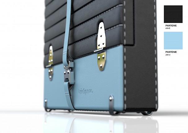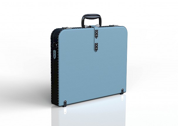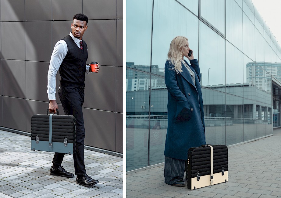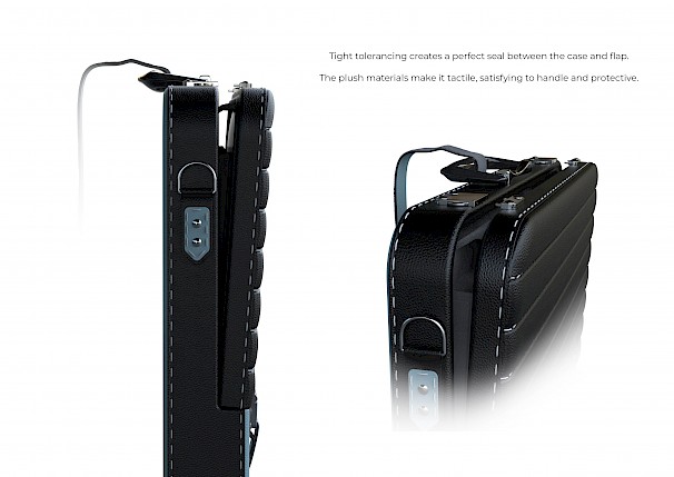 This is a sustainable product which exudes quality due to the rigid aluminium foam shell, contemporary leather finish (Mylo™️ mushroom leather) and stainless steel hardware.