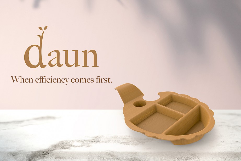 Daun is disposable, multifunctional tableware made from a sustainable materials. Daun is able to hold greasy food and is also puncture resistant, making it really durable. It is available at an affordable price and negates the need for users to purchase a range of different sized vessels. Daun is comfortable and stylish in a natural way that can fit different occasions because of its neutral CMF.