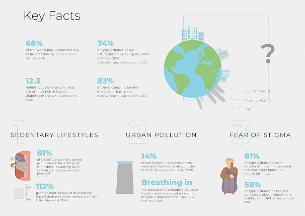 Urban growth and diabetes are raising simultaneously and this is no coincidence. Sedentary work and leisure as well as heightened exposure to air pollution are systematic to urban areas, both of which have recently been discovered to be massively contributing to raising blood glucose levels.