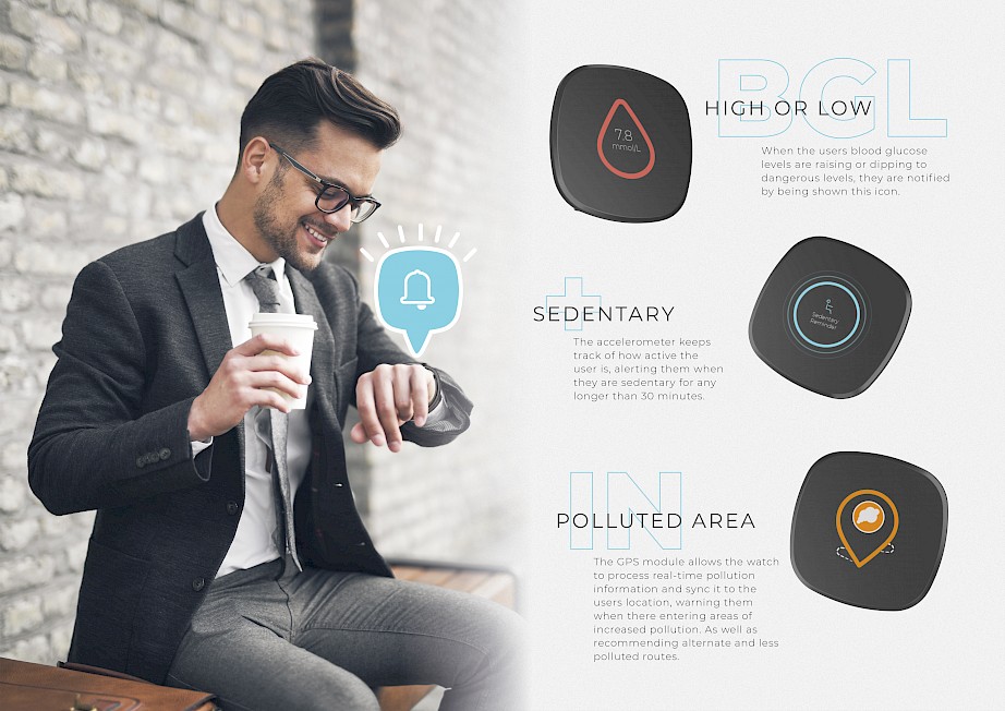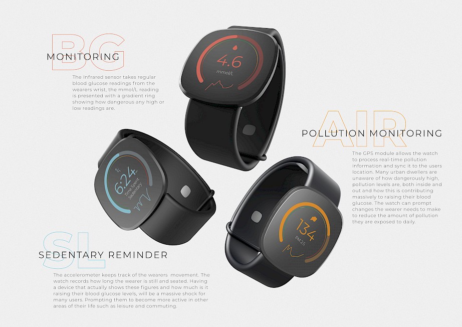 Hi I'm Sam, I studied MDes Product Design at Coventry University. My project is about preventing the Type 2 epidemic in urban areas. The product I designed is called Canli, meaning to live or to live freely. Canli is a discrete, non invasive blood glucose monitor, which is predominately a watch, but can also be worn as a necklace and around the body.