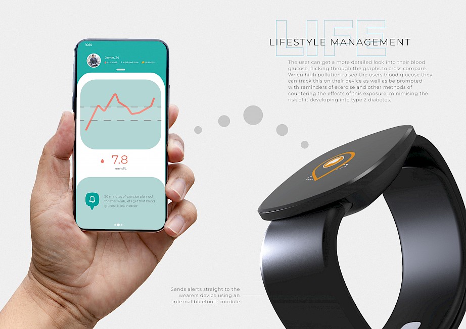 Canli is a lifestyle management device for people living in urban areas. The wearer will be aware of how their work, travel and leisure affects their blood glucose levels as well as being notified and guided by Canli, to make subtle, day-to-day lifestyle changes in order to keep it regulated.