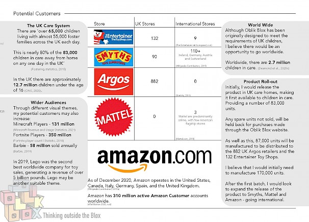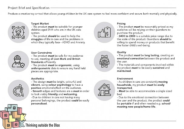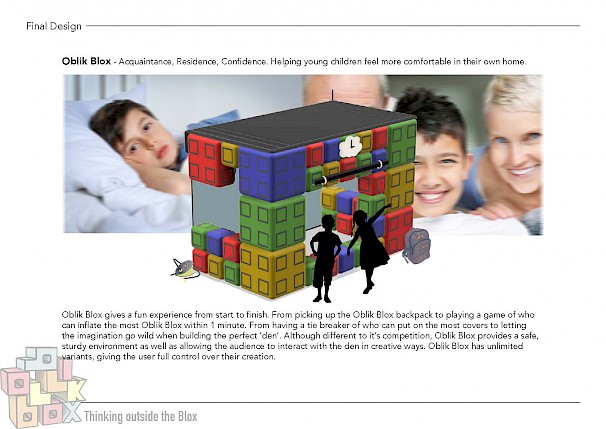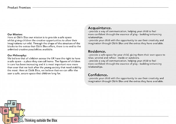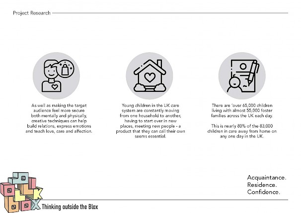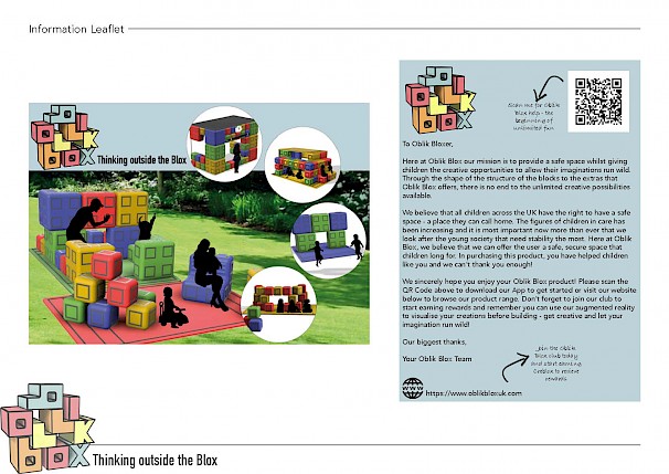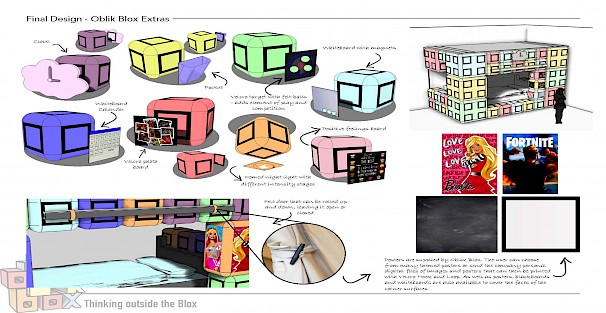 My name is Steph and I live in Coventry. I am an outgoing, friendly individual that enjoys using my imagination and creativity to generate solutions to different problems. My final major project focuses on the 7–11 year olds in the UK care system and the typical problems they face on a daily basis. Foster children are constantly moving from one household to another, having to start over in new places, meeting new people – a product that they can call their own seemed essential. Oblik Blox enhances the user's creativity whilst providing the opportunity to make the audience feel secure both mentally and physically in their own home.
