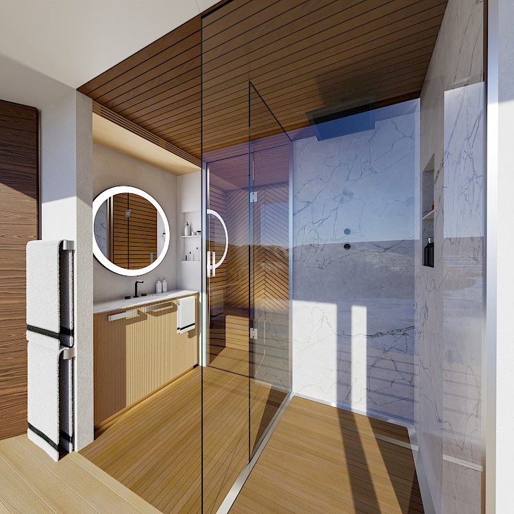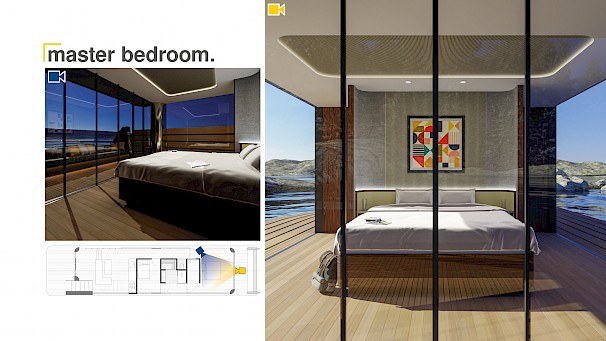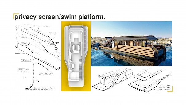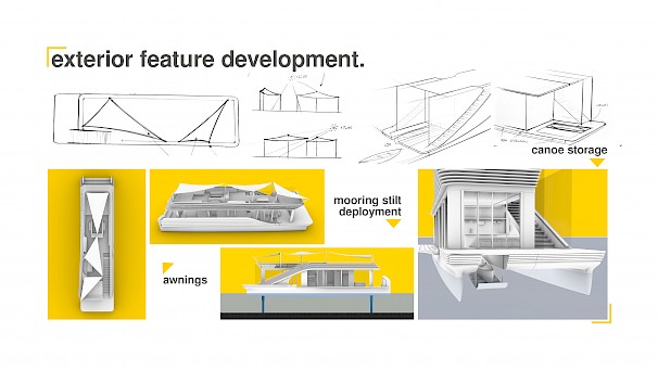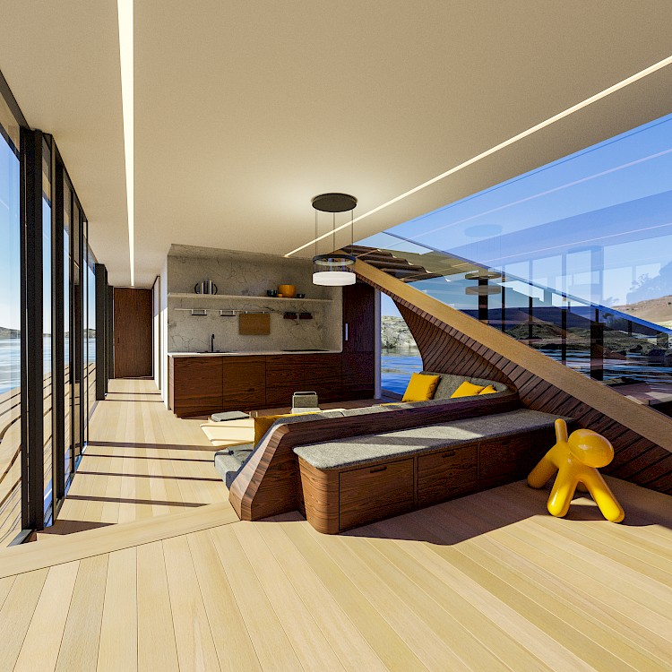 Once in place users are able to have the privacy screens lowered to become swim platforms that extend the outdoor space. Canoes housed in the garage under the stern deck are also available for users to further explore their environment.