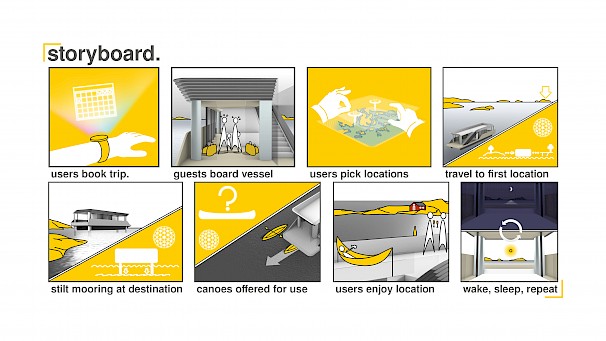 When users first board the vessel, they will decide which locations they would like to visit using the Information Bar display. The vessel will navigate autonomously and once it reaches the chosen location, the vessel will use its stilt mooring system which will lift the weight of the vessel from the water to keep it stationary.
