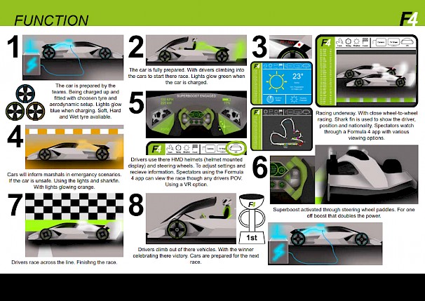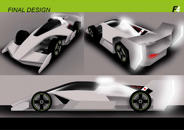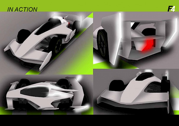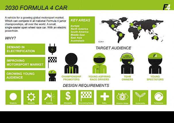 A vehicle for a growing global motorsport market. Which can compete in all national Formula 4 junior championships, all over the world in 2030. A small, single-seater open wheel race car. With an electric powertrain.
