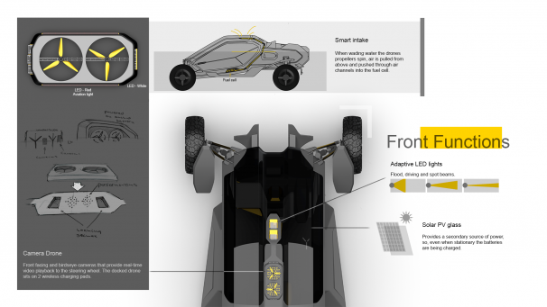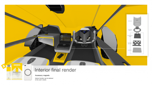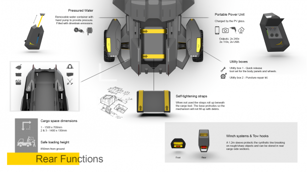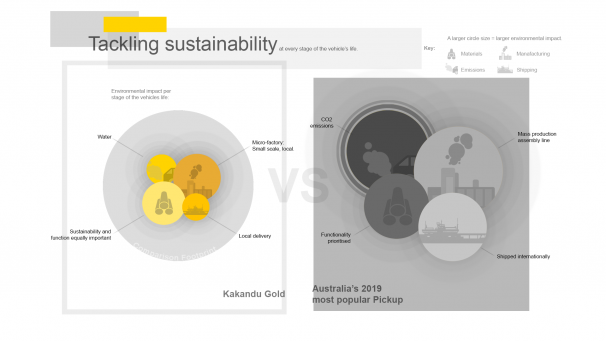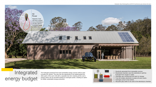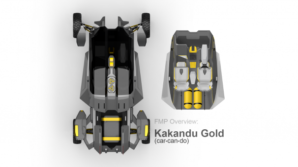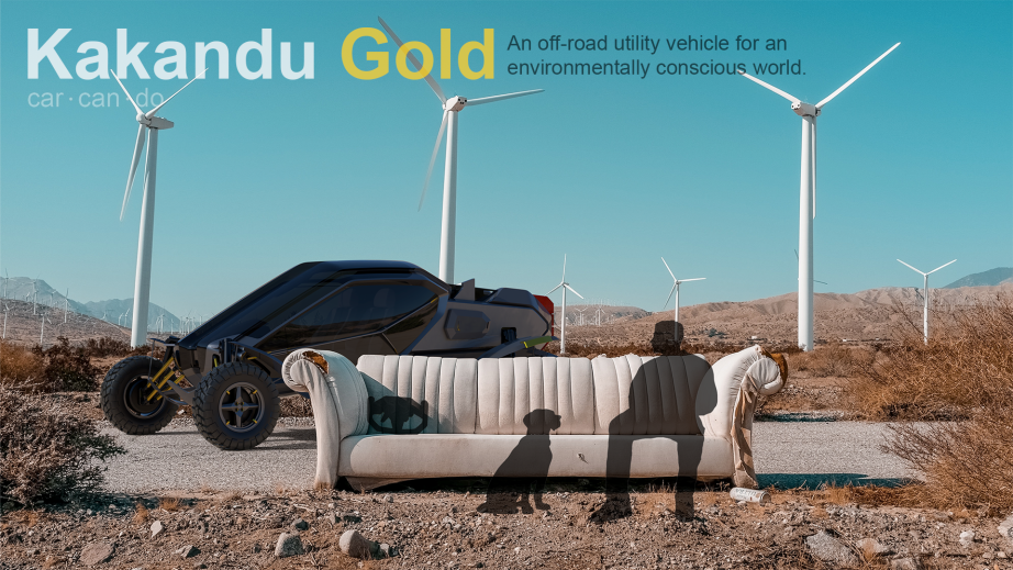 Kakandu (car-can-do) Gold is a hydrogen fuel cell powered, off-road utility vehicle, designed for the diverse terrains of rural Australia and New Zealand. The Kakandu Gold's environmental footprint is reduced throughout every stage of its life. This is achieved through the use of sustainable materials, micro-manufacturing with implementation into local markets, an integrated energy production system and innovative drivetrain.