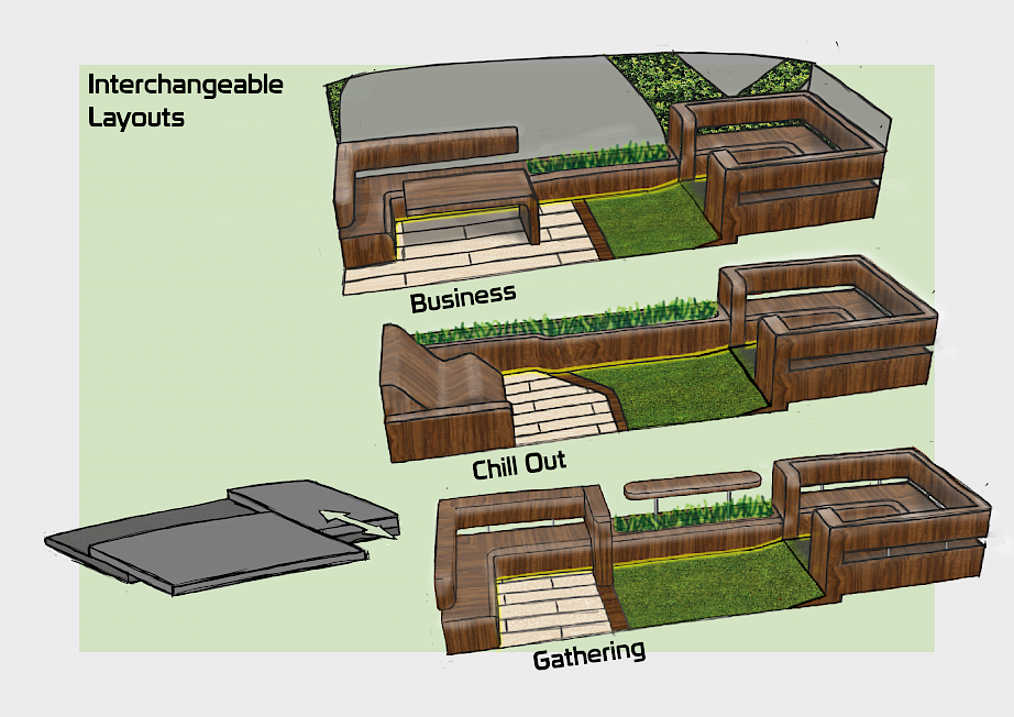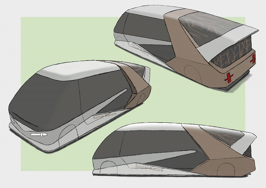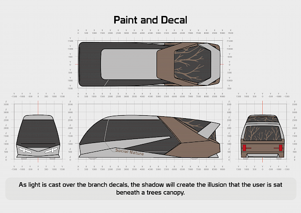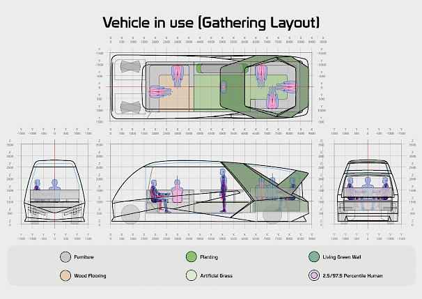 With technology ever present in our lives, this project is about bringing people together, face to face. A social space for entertaining, an area that allows the user to interact with a naturally inspired environment, gaining the mental/physical rewards that nature has to offer. It will be a Hydrogen/Electric powered autonomous city vehicle, rented by the customer through the use of an app, giving them the choice of three interior layouts to accommodate their required needs. It will be rolled out in cities in the year 2030.