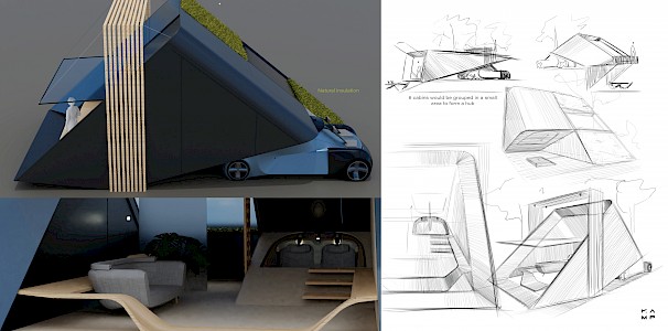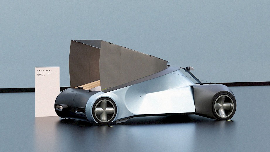 Providing a New aesthetic associated with the industry KAMP is a compact, two-person, autonomous Micro camper. Designed to be used as a tool to explore areas of interest and provide a theatrical sleeping experience in the outdoors. Exploring the idea of vehicle - architecture integration, all the amenities needed for a 2-5 day are taken away from the camper and placed in pieces of Interesting micro-architecture across the country. These will form as 6 building hubs acting as a base for local exploration. The camper will dock seamlessly with the underside of the buildings acting as useable space.