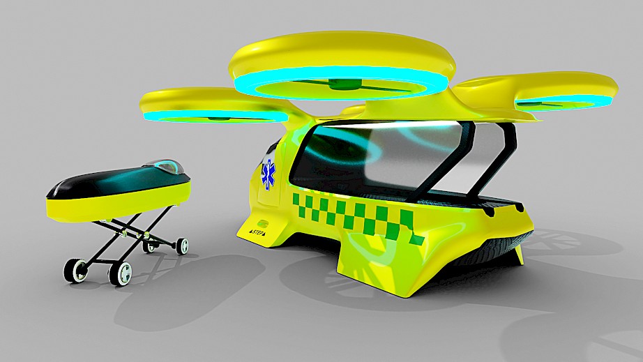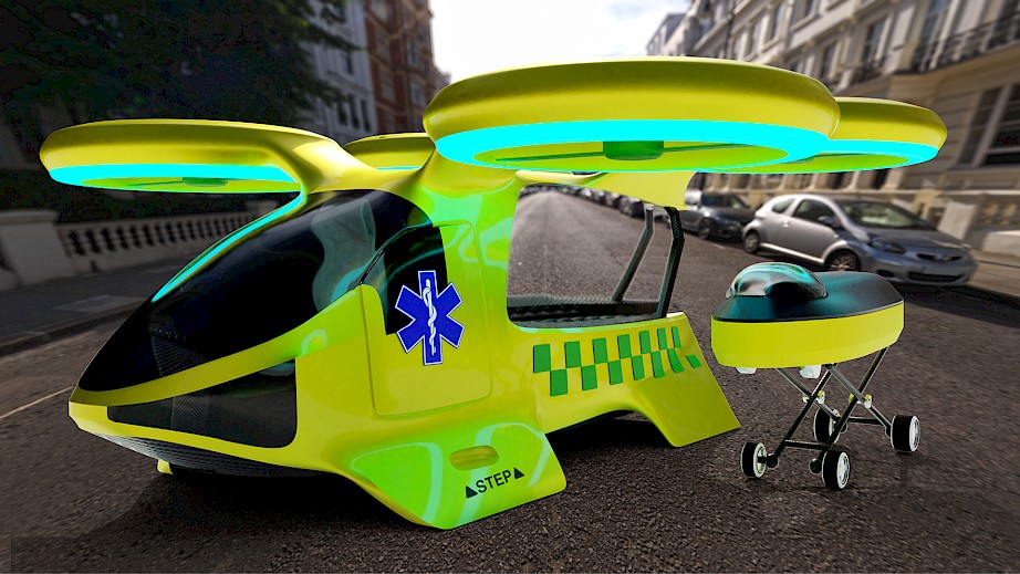 EMS EVTOL 2040 is an electronic vertical take-off and landing vehicle (EVTOL) marketed to the medical sector, operating within London for the year 2040. The primary function is to transport critical state patients within the golden hour for immediate medical treatment.
