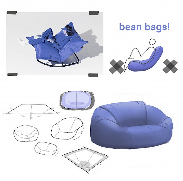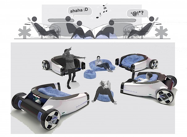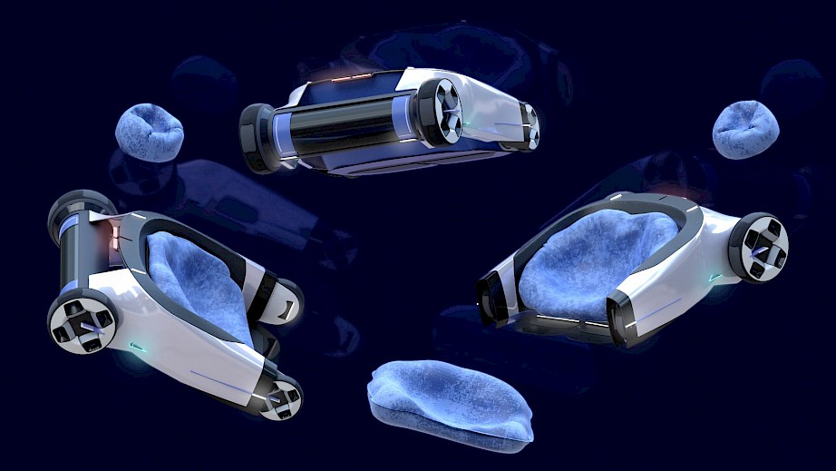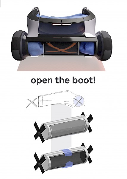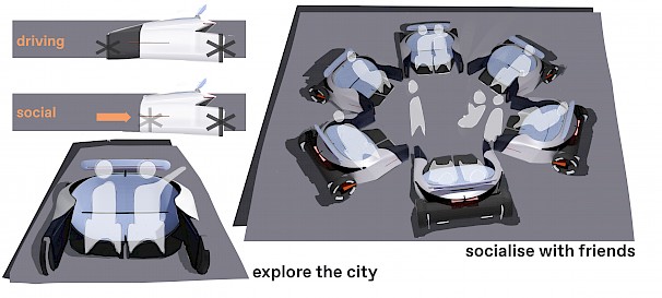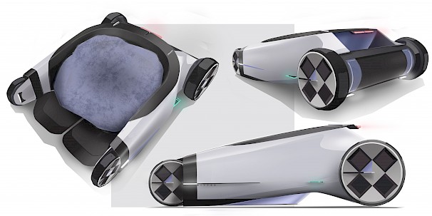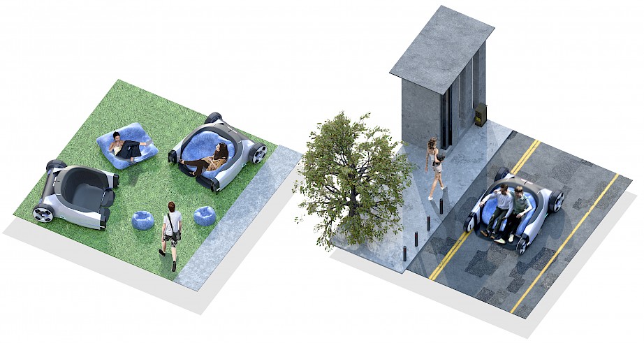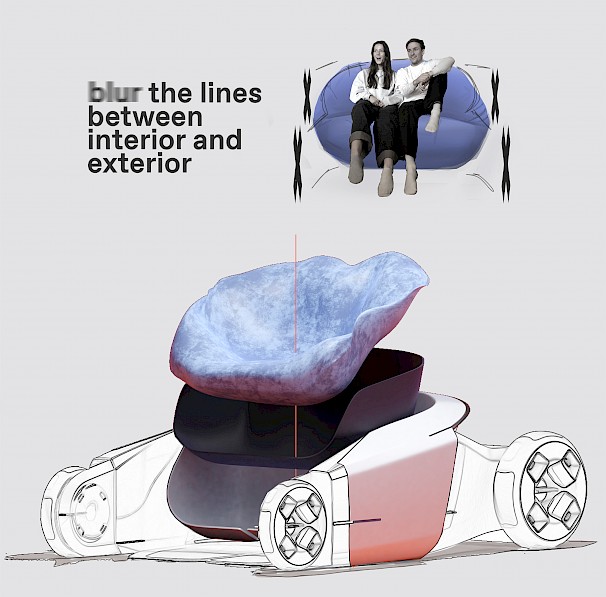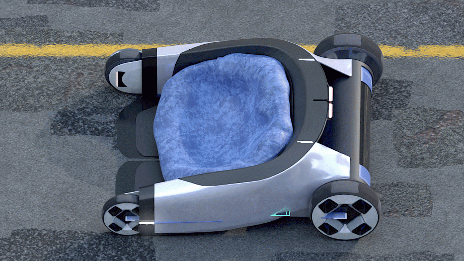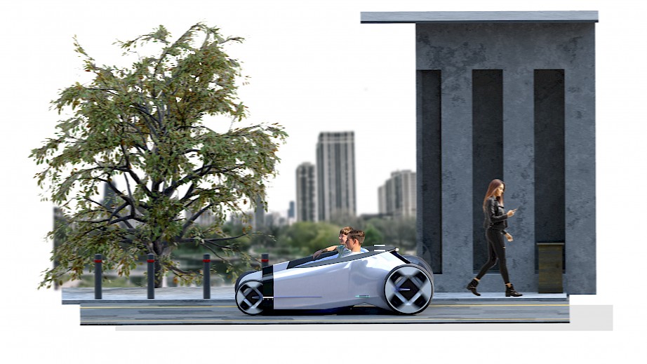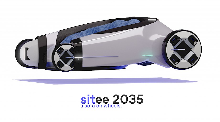 Sitee 2035 is an urban lifestyle vehicle designed for young individuals to explore the city and socialise with other user's creating 'outdoor living rooms'. With removable bean bags and a lack of boundary between interior and exterior, the vehicle allows the user's to dictate their social space once stationary, then immersing themselves in the urban environment whilst moving.