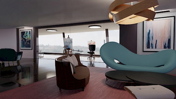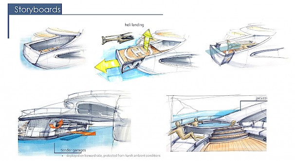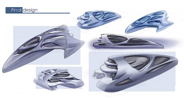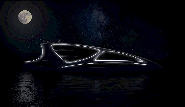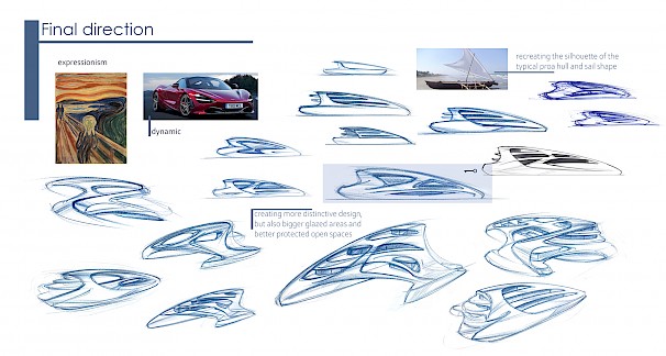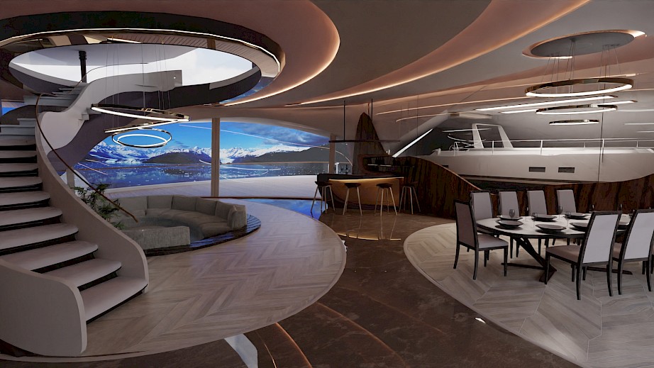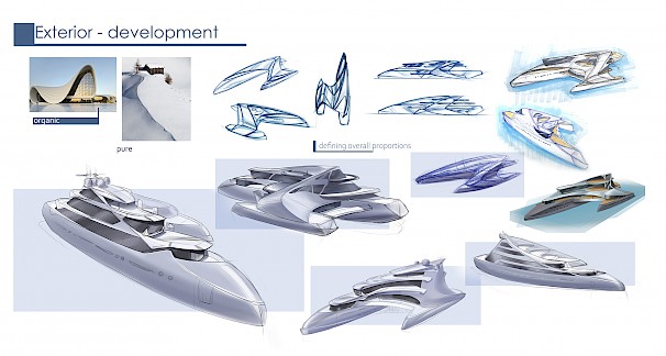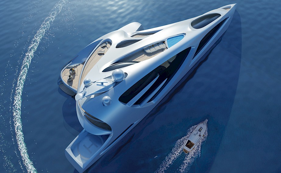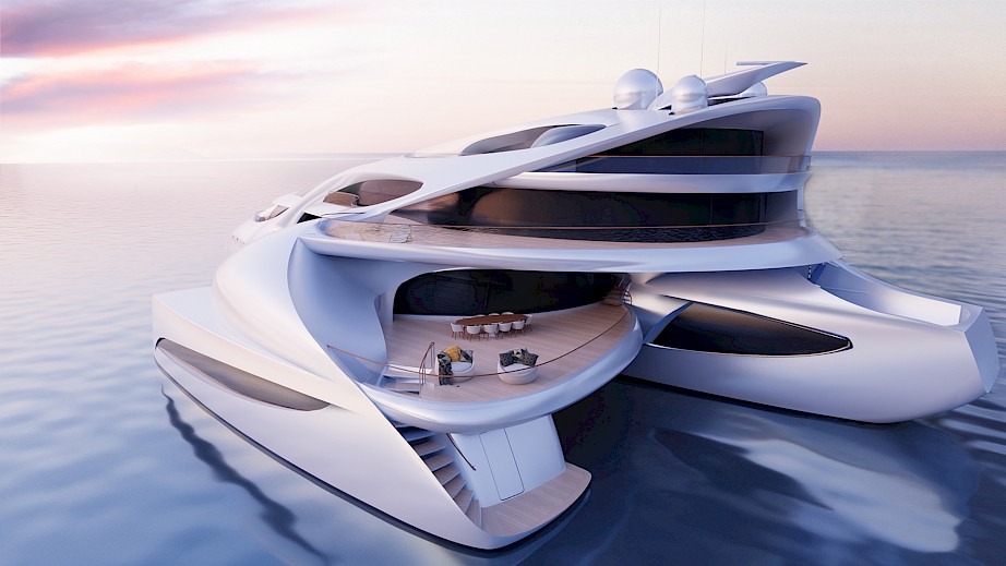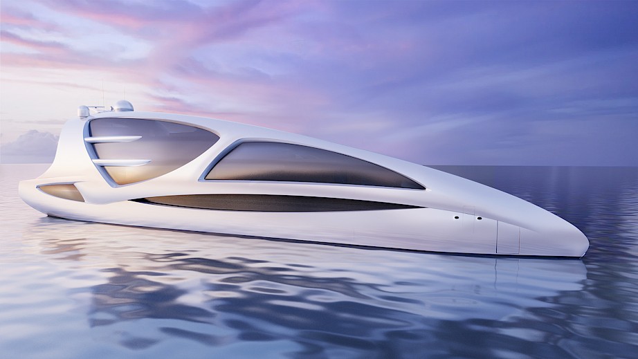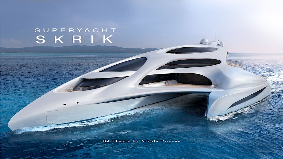 Superyacht Skrik - inspired by Edward Munch's artwork 'The Scream', this 74m long, hydrogen powered yacht embodies the scream of the upcoming younger generation of owners. Based on the asymmetrical proa layout, it enhances the advantages of multihulled vessels over monohulls even further, which contributes for improved experience and more sustainable design.