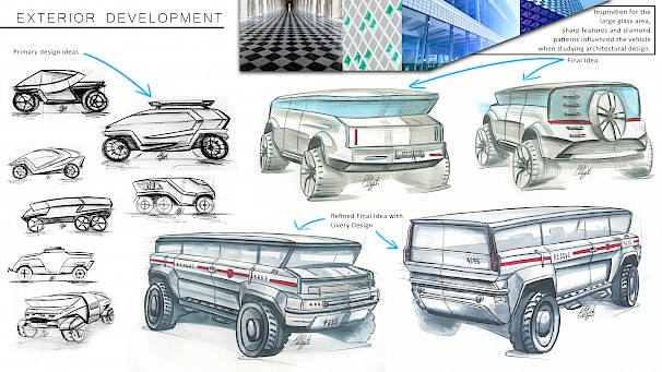 I have built a detailed Alias exterior to create the images shown and I am skilled in digital 2D and 3D rendering processes. I enjoy working with both interiors and exteriors of transportation and have also investigated designing vehicle accessories as part of my design work.