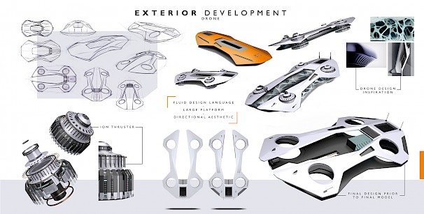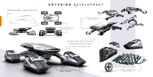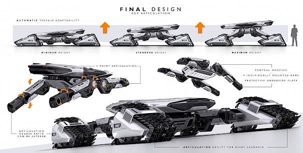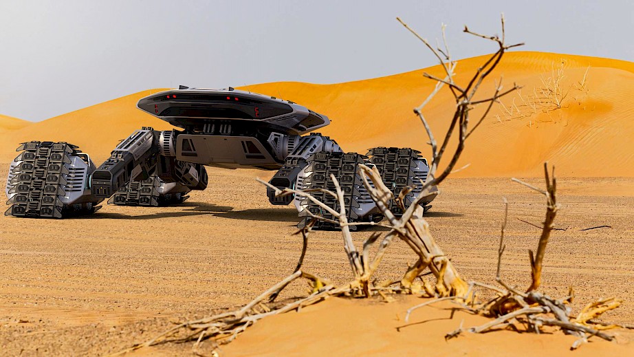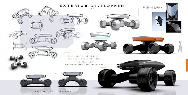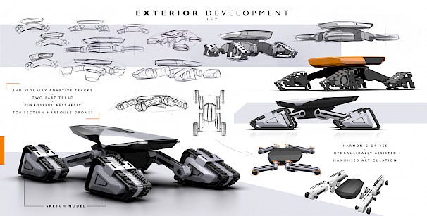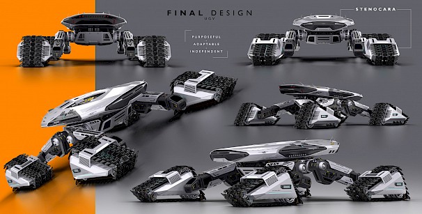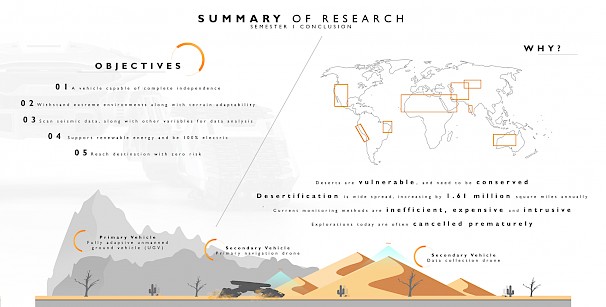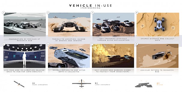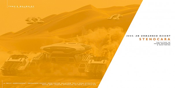 My project, An Unmanned Desert Stenocara, explores the future of desert research and monitoring in the year 2045. It provides a fully independent, unmanned desert monitoring solution for a more effective, safer and logical approach to data collection and research. It achieves this through the harmonisation of drone relay technology, providing live topography and detailed telemetry of the surrounding environment for vehicle adaptation.