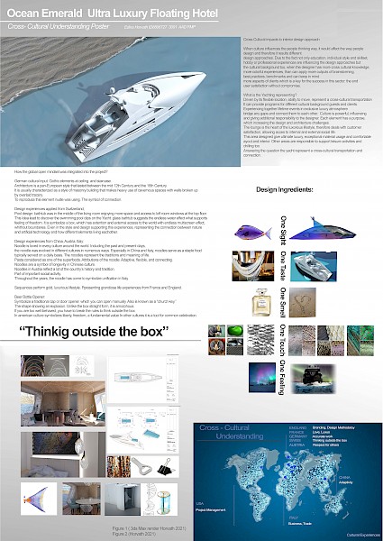 "Thinking outside the box" It has been confirmed that my assertion is, that planning is sometimes like a mathematical theory. We need to apply a scenario to decipher and build the elements. Any small elements and the systems within it are a breath taking design and examined in further detail of facts that uncovered are even more fascinating, creating unexpected discoveries about the symbiosis of different structures. For this methodology, different luxury sectors, not only yachting have been analysed. This trend and market opportunity led the investment to develop the Modular Floating Hotel concept, embracing modern technologies, stylish travel.
