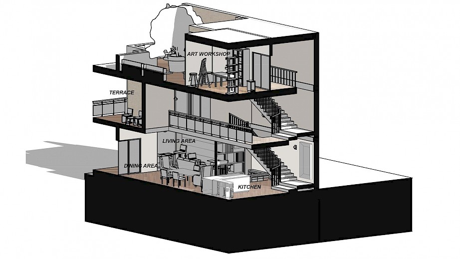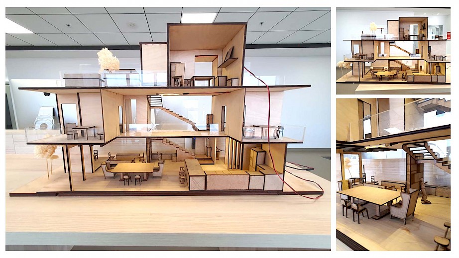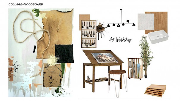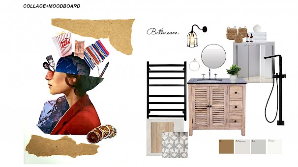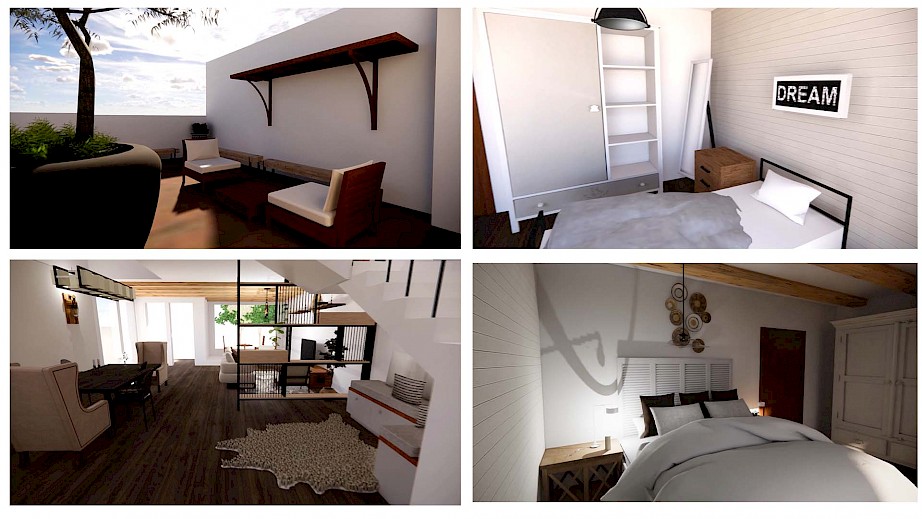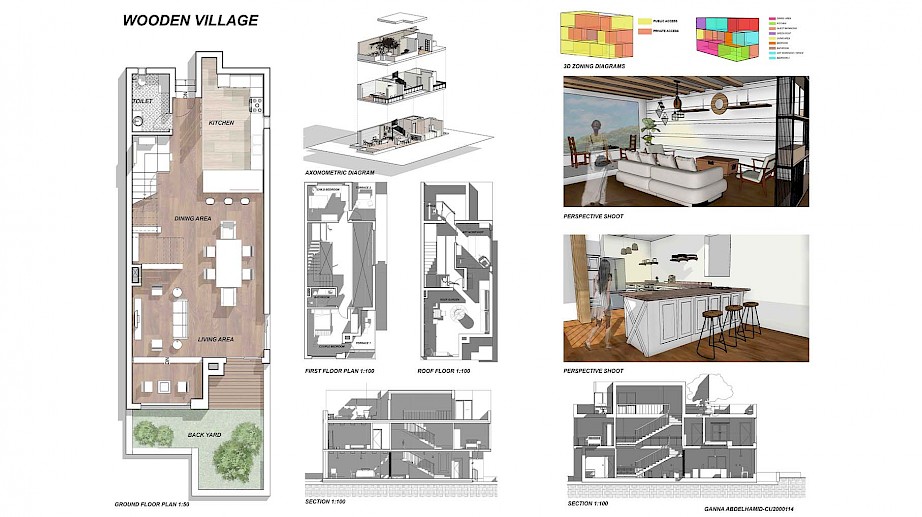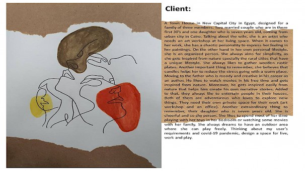 My name is Ganna Abdelhamid. I am 19 years old, studying Interior Architecture and Design. “Design is so simple, that’s why it is so complicated.” Design is not just what it looks, design is how it works. These two quotes made me understand what design is. As an Interior Designer; I am in the stage of understanding how to be creative. During this year, I had the perseverance and determination to work hard, understand the initial stages of the design and most importantly learning from the mistakes that I have done. Our mission in Year 1 was to design a town house, a compound in the New Capital City in Egypt (residential space), thinking about my user’s requirements and covid-19 pandemic, designing a space for live, work and play. Wooden Village is a name given to a modern farmhouse style project which is mix between rustic, vintage and modern. Added to that, the space is designed for two married couples and their daughter. The mother who is an artist, who has an organised personality. Meanwhile, the husband is an author with moody personality. An art studio and an office are required for their careers.