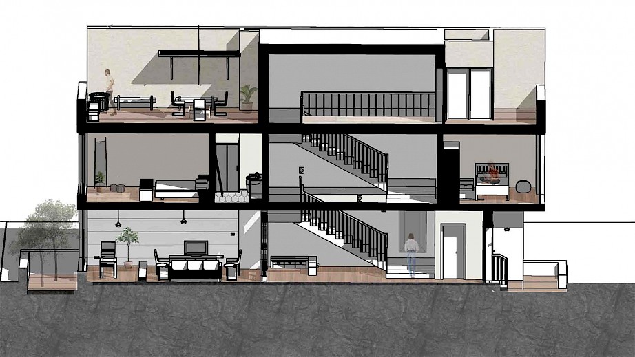 The project intention is to create a well function house that fulfils the user’s needs, but also a space to enjoy and appreciate the outside view. The interior plan takes after impartial colours and natural materials. Also, double height gives the illusion of extra space and connection between two levels. It sneaks in natural light. The floors are mainly made from wood floor, which is a tool to create an impression of bigger space. Using aged wooden beams with shiplap walls that are adhered to drywall lined with insulation to give the living room a very comfortable feel.