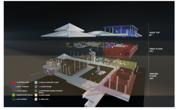 Education and health are considerably in concordance to each other, Finding reliable ways to interrupt the feeling of stress can be difficult as it will inevitably be a factor in everyday life. The purpose of this project is to help guide and support the youth, whether it'd be providing professional therapists, study spaces or temporary accommodations which will hopefully improve their lifestyle and education journey. The Study Centre (SC), located in Ang Mo Kio Street 53, Singapore, and will be providing amalgamation of study spaces (Demographically for 12 to 18-year-olds), health support clinic, cafe and sleeping pods.