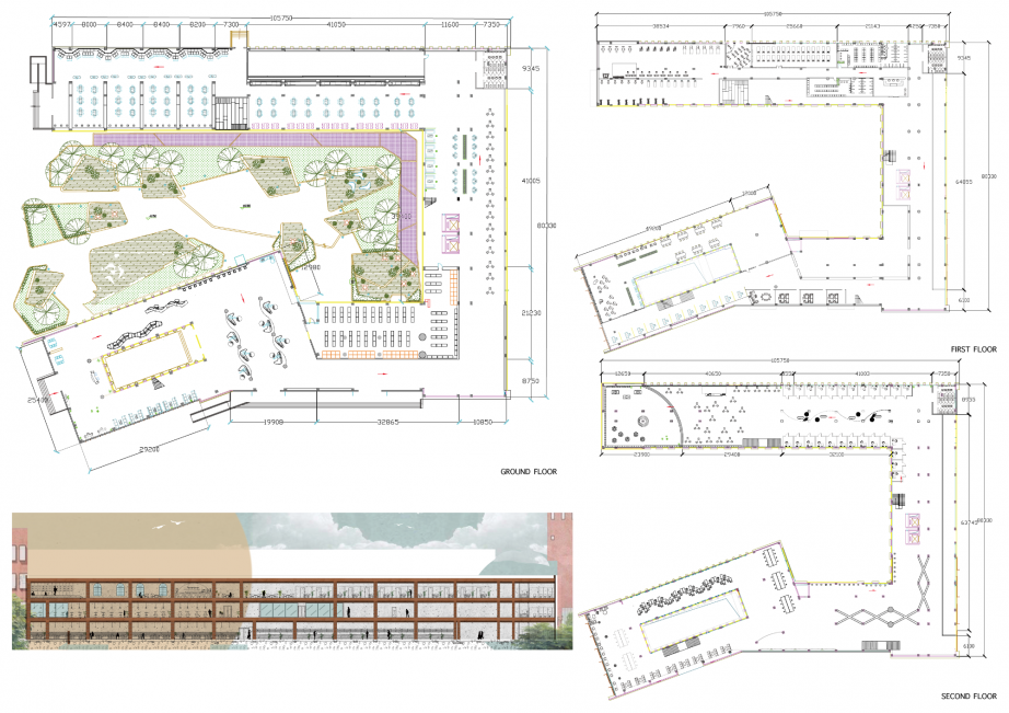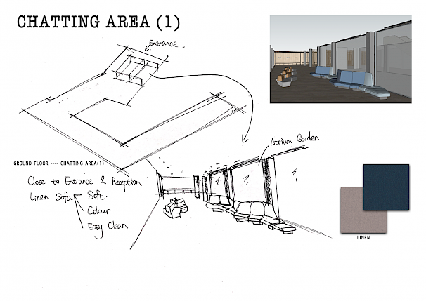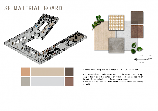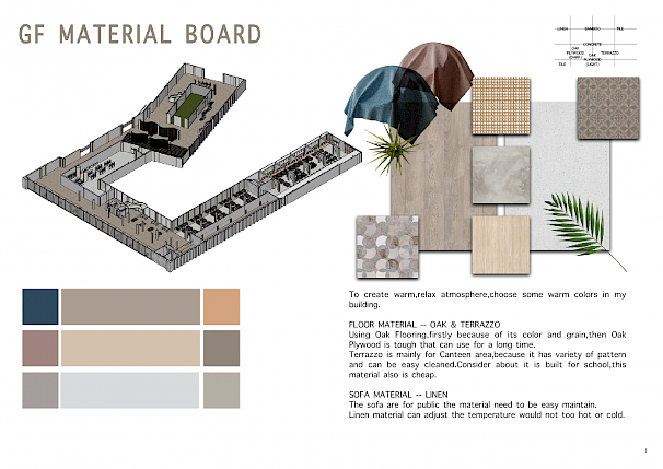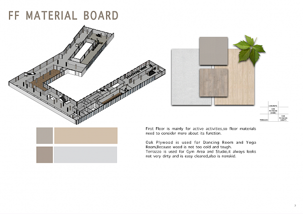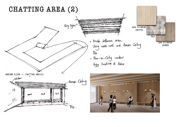 I design three different Chatting area, Shop,Game area and Canteen for Ground Floor;First Floor is mainly for active which has Studio,Dancing Room,Gym area;Second Floor is for quiet activities that has Co-working area,Study room,Reading Area and a small Cafe.