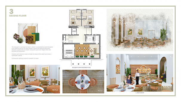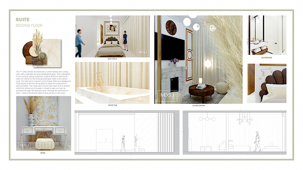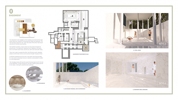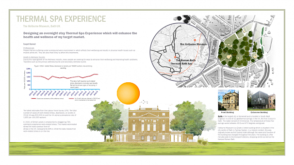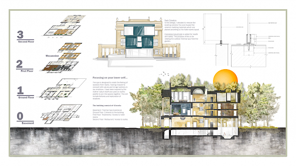 "Focus on your inner self..." This project helps to enhance the health and wellness of my target audience (the professionals and wellness tourists), caused by work-related stress which is a current global problem. I designed an overnight stay thermal spa experience at Holburne Museum, a Grade 1 listed building located in Bath, United Kingdom. Due to its natural hot spring, this place is known for its rich history of the Roman Bath. The design is inspired by nature, utilising textures, and experimenting with shadows to create the feeling of isolation from reality and acquire harmony in our emotions.