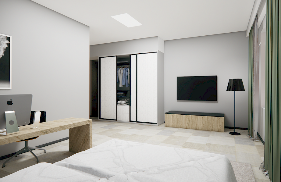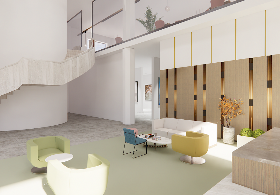 The art area is on the ground floor and is decorated with plants. The dining room and the office also have some plants and windows, the dining room must be airy and have natural light.