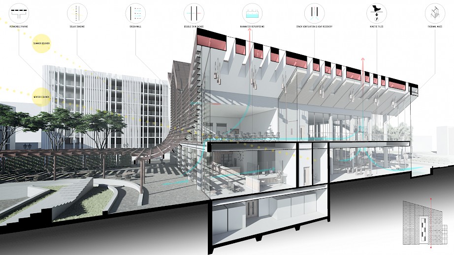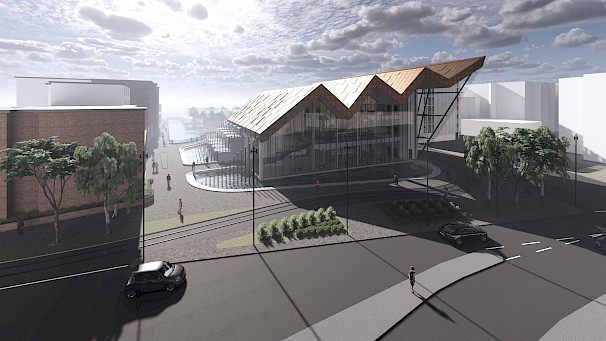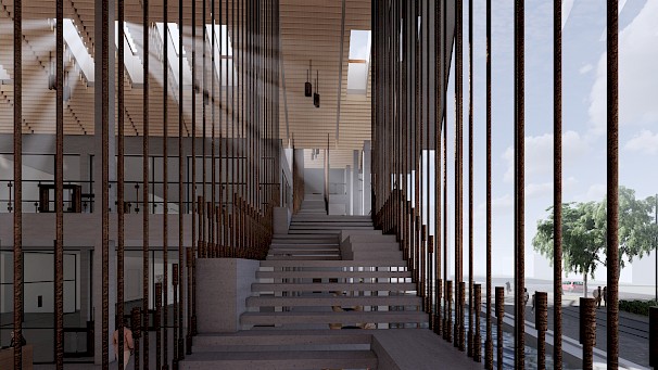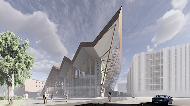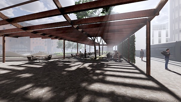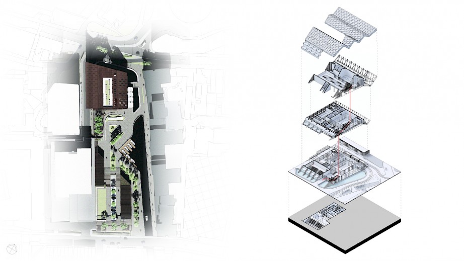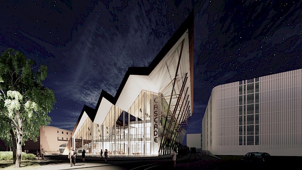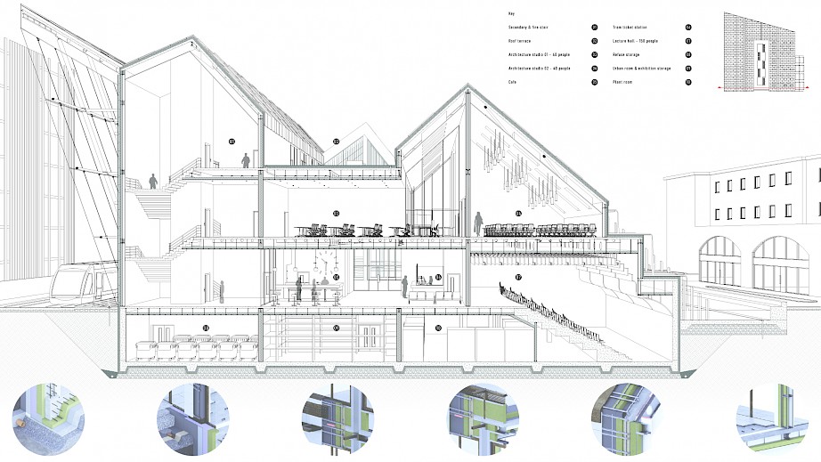 The project: Cascade offers a place for users to connect, learn and relax. The proposal will provide an Urban room for the local Council to display their ideas for the future of the city, along with a tram station to connect locals and visitors all around Coventry. The building will also provide educational facilities for the architecture students of Coventry University, these will include 2 architecture studios, a lecture hall & a communal indoor/ outdoor student space. The cafe will be open to all with a rejuvenated site that will offer recreational and leisure activities for all visitors.